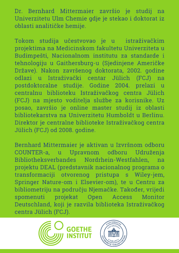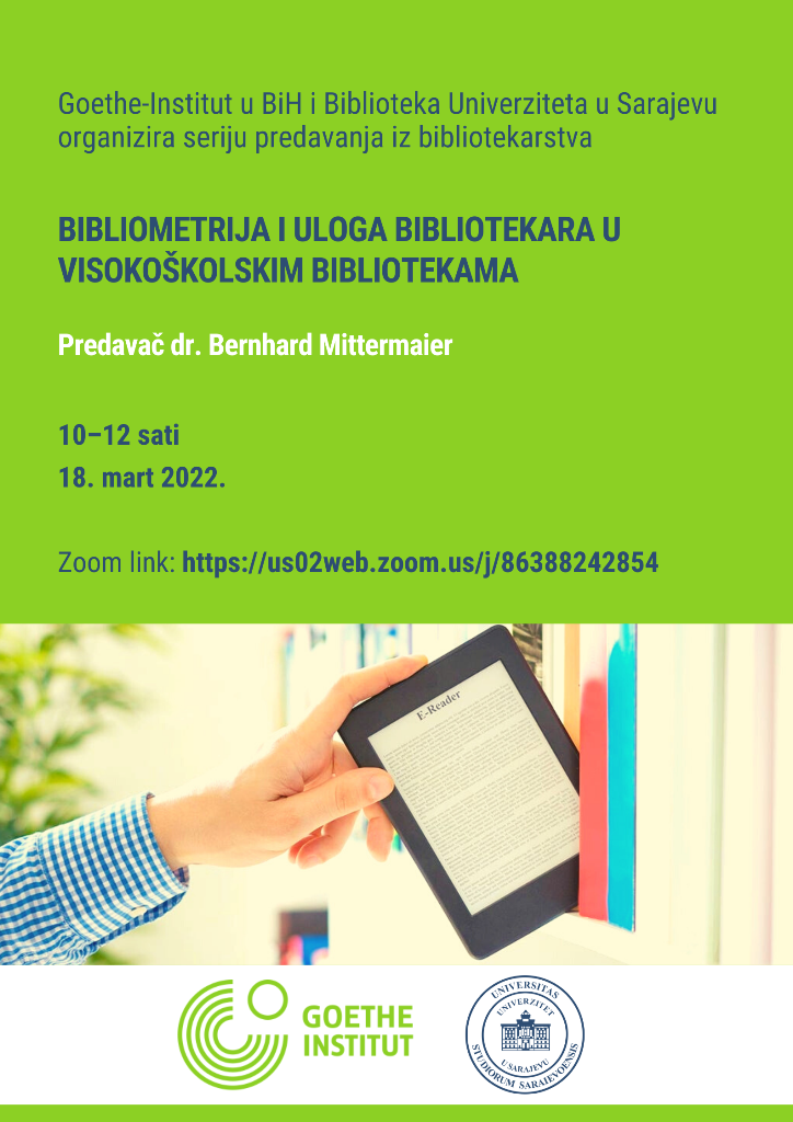 Goethe-Institut u Bosni i Hercegovini u saradnji sa Bibliotekom Univerziteta u Sarajevu organizira predavanje na temu „Bibliometrija i uloga bibliotekara u visokoškolskim bibliotekama“. Pozvani predavač je dr. Bernhard Mittermaier, ugledni stručnjak iz oblasti bibliometrije i otvorenog pristupa. Predavanje je namijenjeno nastavnom osoblju i bibliotekarima. Učesnici će imati mogućnost da predavanje prate na njemačkom ili b/h/s jeziku. Predavanje će se održati putem zoom link-a 18. marta 2022. godine od 10:00 do 12:00 sati.
