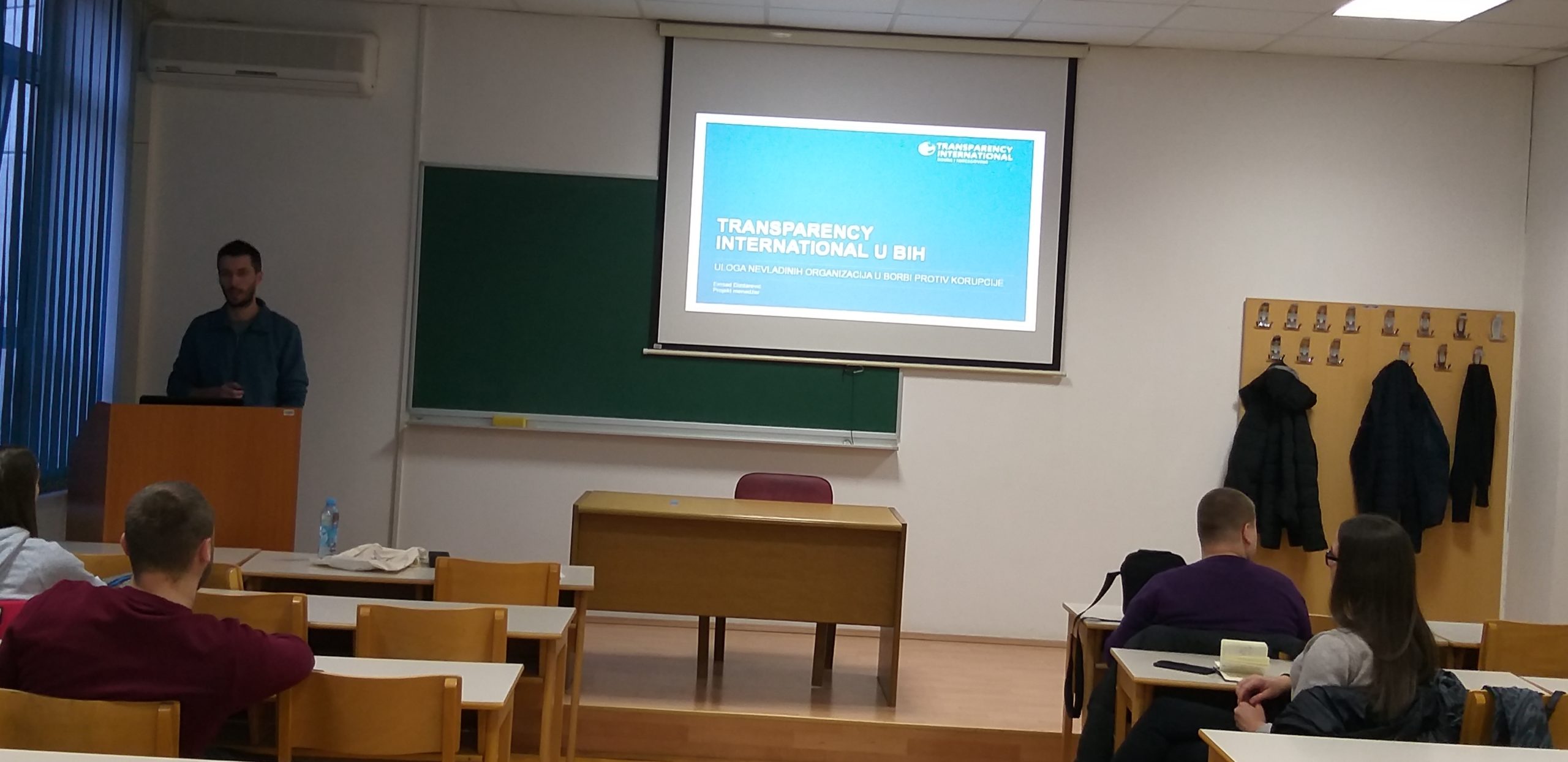 U okviru predavanja na predmetu Savremena politologija studenti druge godine Odsjeka za politologiju (usmjerenje „Upravljanje državom“) Fakulteta političkih nauka Univerziteta u Sarajevu imali su priliku slušati predavanje projektnog menadžera Transparency Internationala u BiH Emsada Dizdarevića o temi „Uloga nevladinih organizacija u borbi protiv korupcije“. Nakon održanih predavanja uslijedila je diskusija o utjecaju korupcije na funkcioniranje društva. Studenti i predmetna profesorica doc. dr. Ehlimana Spahić su zahvalili Transparency Internationalu u BiH i predavaču na odličnom predavanju i korisnim savjetima.