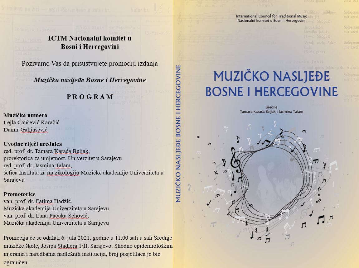Promocija Zbornika radova Muzičko nasljeđe Bosne i Hercegovine koji su uredile Tamara Karača Beljak i Jasmina Talam održat će se u utorak, 6. jula 2021. godine u 11,00, u sali Srednje muzičke škole, Josipa Stadlera 1/II, Sarajevo.