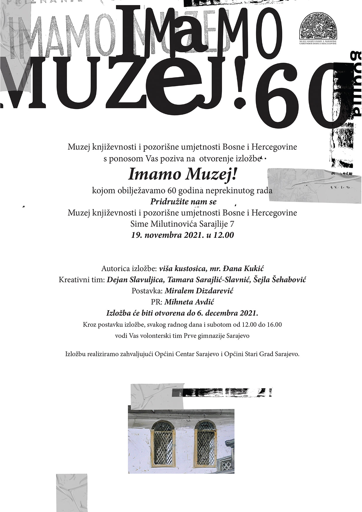 Muzej književnosti i pozorišne umjetnosti Bosne i Hercegovine u povodu 60. godišnjice rada priprema izložbu pod nazivom "Imamo Muzej", a koja će biti otvorena 19. novembra ove godine.