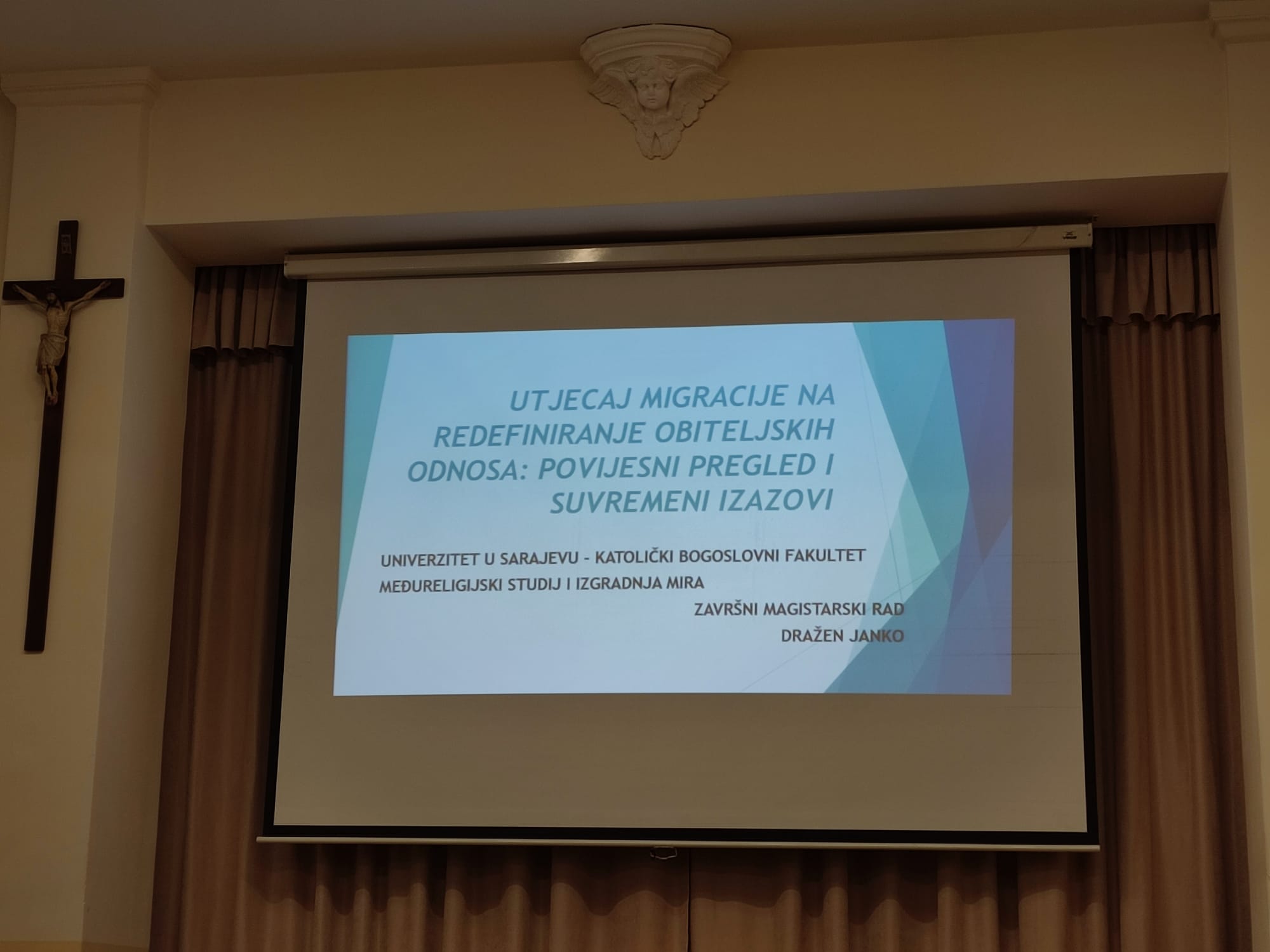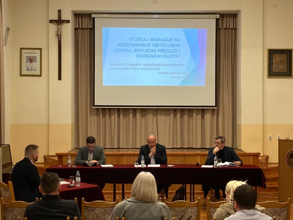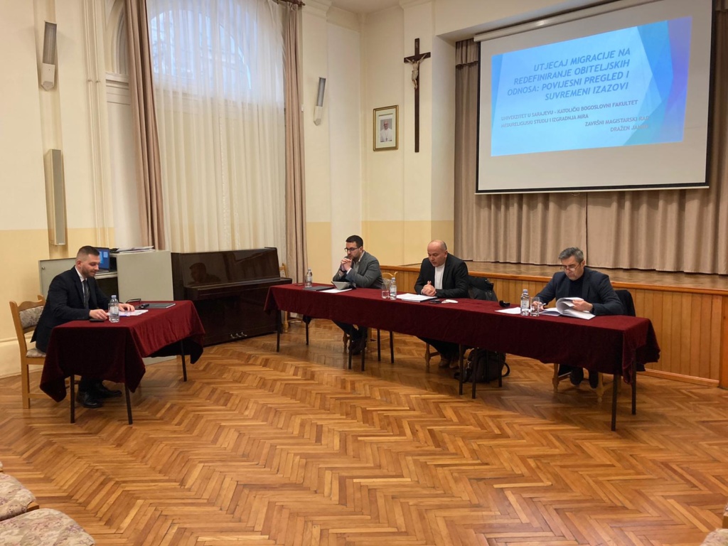 U srijedu 9. ožujka 2022. godine u 16h u prostorijama Katoličkog bogoslovnog fakulteta student Master studija Dražen Janko uspješno je obranio završni rad pod naslovom: “Utjecaj migracije na redefiniranje obiteljskih odnosa: povijesni pregled i suvremeni izazovi”. U Povjerenstvu su bili: Izv. prof. dr. Šimo Maršić, predsjednik; Izv. prof. dr. Pavle Mijović, mentor član; Prof. dr. Dino Abazović, član. Ovim je kolega Dražen Janko postao 12. magistar Međureligijskih studija i izgradnje mira, zajedničkog master studija tri fakulteta (Fakultet islamskih nauka Univerziteta u Sarajevu, Katolički bogoslovni fakultet u Sarajevu i Pravoslavni bogoslovski fakultet Sv. Vasilije Ostroški Univerziteta Istočno Sarajevo u Foči).