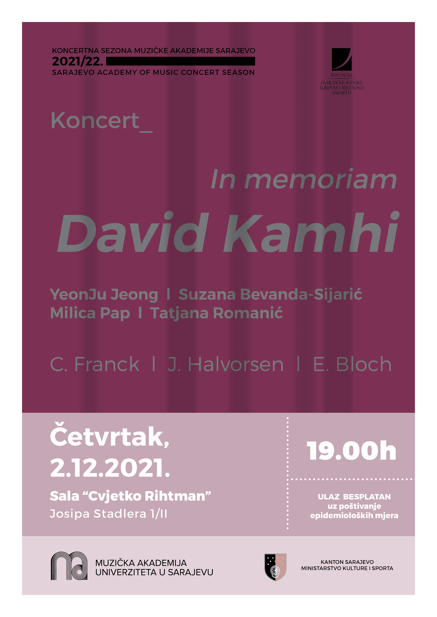 Muzička akademija Univerziteta u Sarajevu će prirediti koncert u znak sjećanja na istaknutog člana Jevrejske zajednice u Bosni i Hercegovini, violinistu i profesora Davida Kamhija (1936-2021), koji je ostao upamćen po svom neumornom pedagoškom, umjetničkom i društvenom angažmanu. Tim povodom nastupit će violinistica YeonJu Jeong, violistica Tatjana Romanić, te pijanistice Suzana Bevanda-Sijarić i Milica Pap. Ovaj događaj će biti održan u četvrtak, 2. decembra 2021. godine u 19 sati, u Koncertnoj sali “Cvjetko Rihtman”.