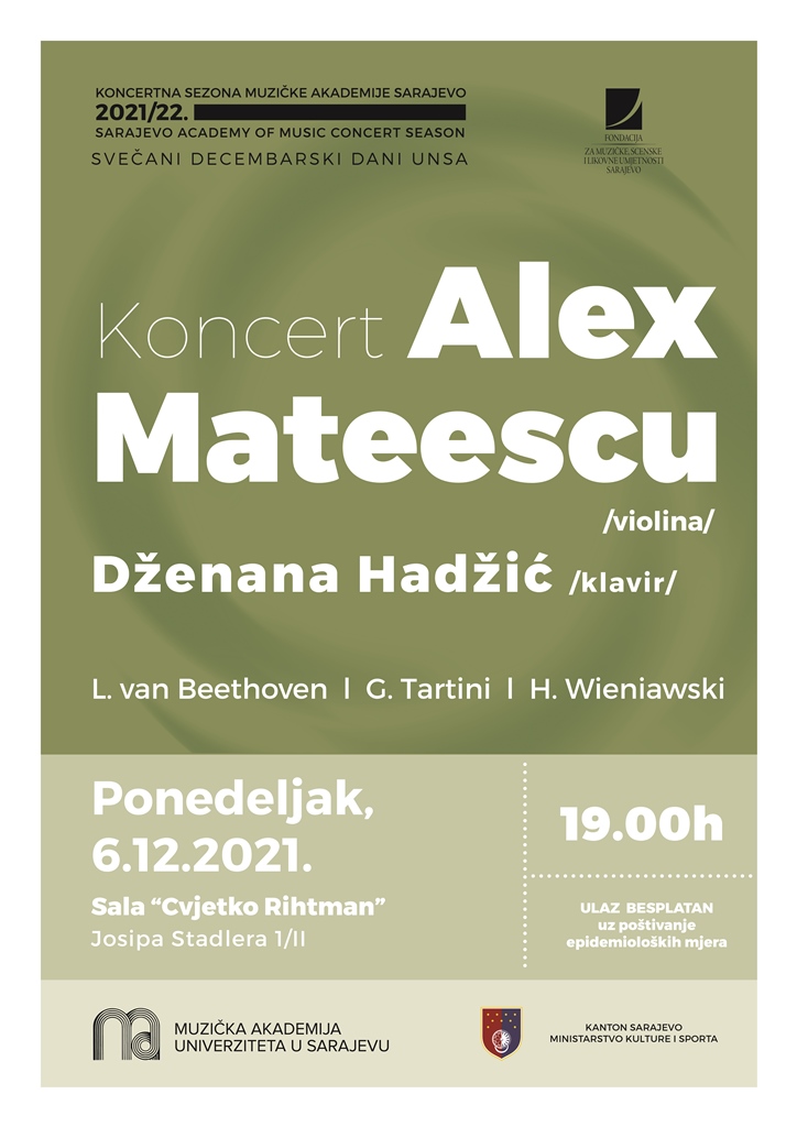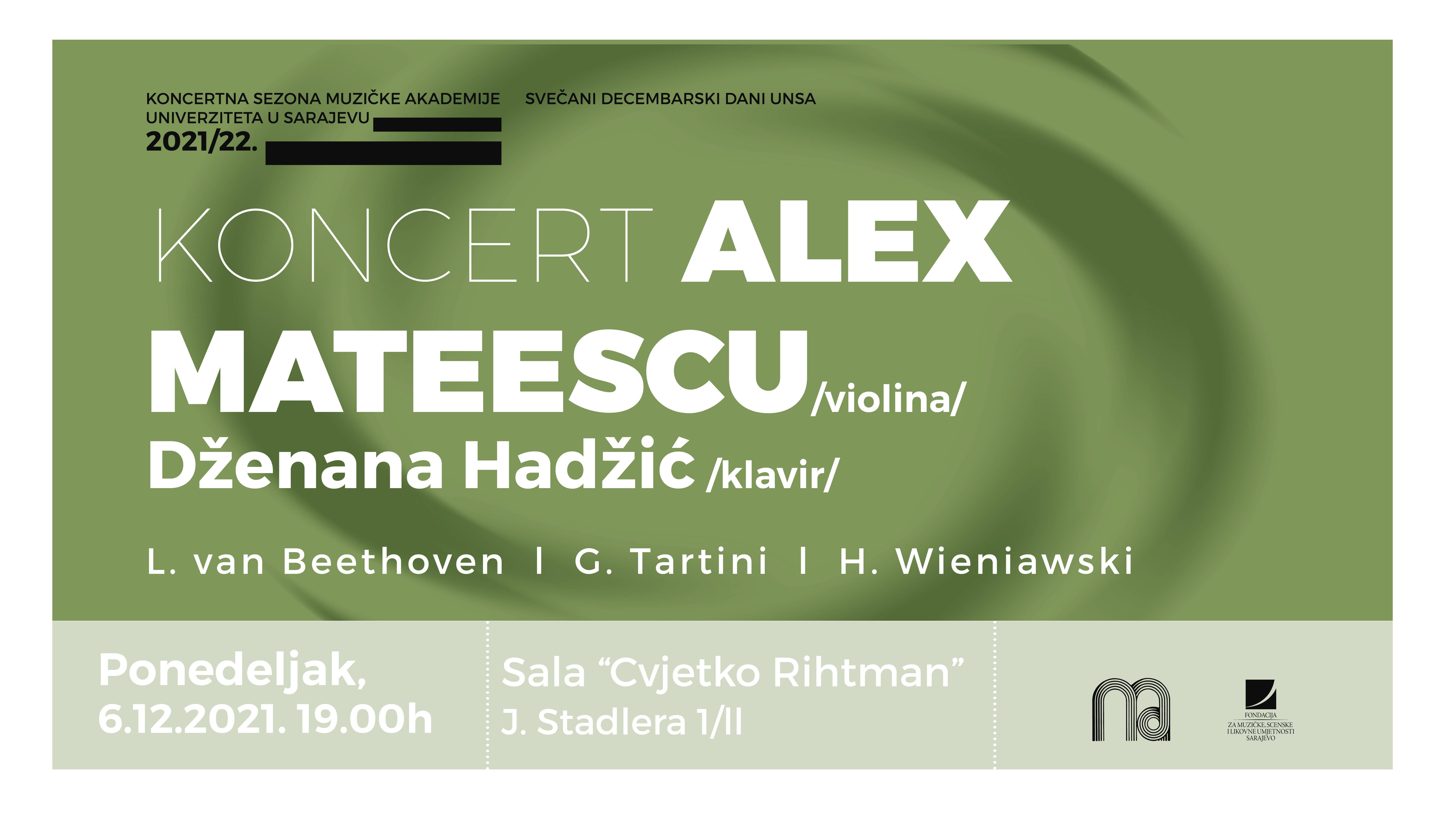 Koncertna sezona Muzičke akademije Univerziteta u Sarajevu i u novoj akademskoj godini nastavlja afirmisati rad studenata svih odsjeka, ističući taj segment svoje djelatnosti kao jedan od ključnih. U sklopu decembarskog repertoara, predstavit će se Alex Mateescu, mladi violinista i student treće godine u klasi prof. Marka Simovića, koji će nastupiti uz klavirsku pratnju Dženane Hadžić. Koncert će se održati u ponedjeljak, 6. decembra 2021. godine, u 19 sati u Koncertnoj sali “Cvjetko Rihtman“ kao dio programa Svečanih decembarskih dana UNSA.