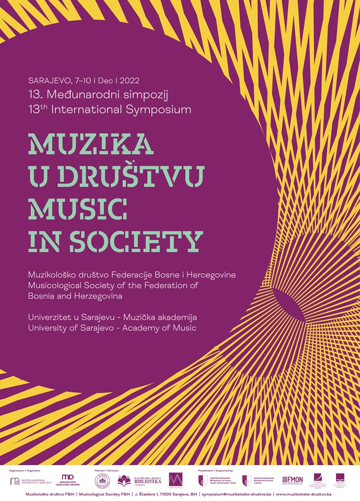 Muzikološko društvo FBiH i Univerzitet u Sarajevu – Muzička akademija 13. Međunarodni simpozij “Muzika u društvu” realiziraju u saradnji sa Gazi-Husrev-begovom bibliotekom i Zemaljskim muzejom Bosne i Hercegovine uz podršku Ministarstva za nauku, visoko obrazovanje i mlade Kantona Sarajevo, Ministarstva za kulturu i sport Kantona Sarajevo, Federalnog ministarstva obrazovanja i nauke, Fondacije za muzičke, scenske i likovne umjetnosti te Fondacije za izdavaštvo.