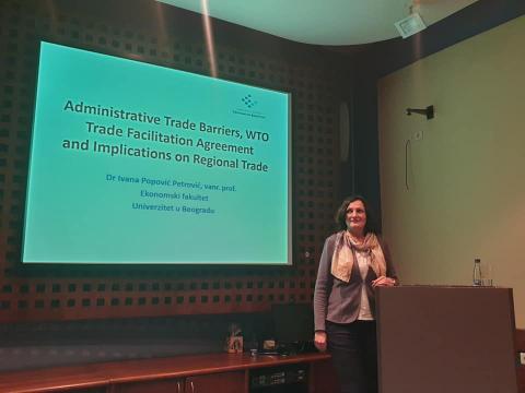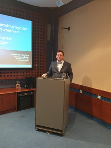 Gosti predavači su bili prof. dr. Predrag Bjelić, rukovodilac Katedre za međunarodne ekonomske odnose Ekonomskog fakulteta Univerziteta u Beogradu i ekspert UN-ove Konferencije za trgovinu i razvoj i Svjetske trgovinske organizacije za pitanja međunarodne trgovine, i prof. dr. Ivana Popović Petrović, također sa Ekonomskog fakulteta Univerziteta u Beogradu, ekspertica za oblast necarinskih trgovinskih barijera. Predavanju je prisustvovao veći broj studenata master-studija, te dodiplomskog studija odsjeka Ekonomija. Uvaženi gosti su sa našim studentima podijelili svoje znanje o aktuelnim temama u vezi sa promjenom u strukturi međunarodne trgovine i globalnim lancima vrijednosti, te o administrativnim necarinskim barijerama i olakšavanjem trgovinskih tokova, sa posebnim osvrtom na reperkusije po region jugoistočne Evrope.