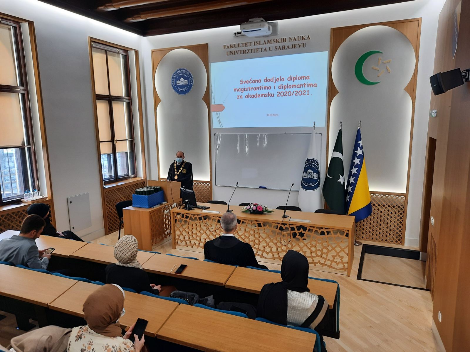 Dekan Fakulteta islamskih nauka prof. dr. Zuhdija Hasanović naveo je kako ove godine imaju 63 diplomanta i 20 magistranata. „Na oba ciklusa imamo svršenike s tri studijska programa. Posebno nam je drago da ove godine imamo osam dobitnika posebnih priznanja Univerziteta u Sarajevu, pet dobitnika Zlatne, a tri dobitnika Srebrene značke. Ove godine najbolji student je Edin Čolaković, s prosjekom ocjena 9,7“, naveo je dekan Hasanović.