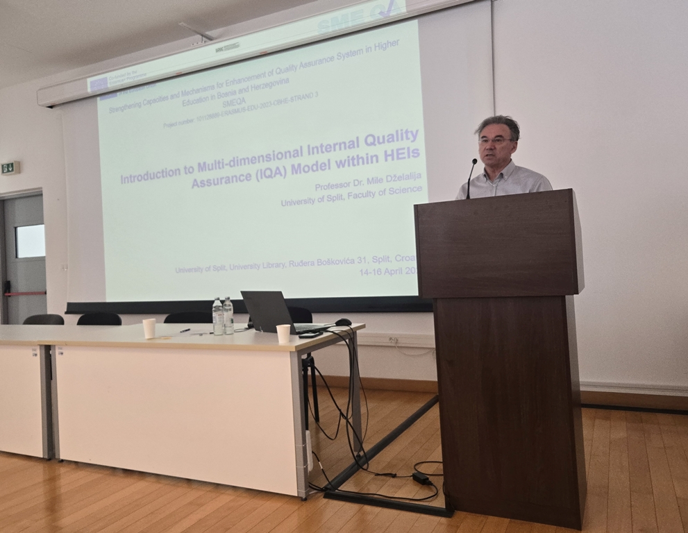 U okviru ERASMUS+ CBHE projekta “Strengthening Capacities and Mechanisms for Enhancement of Quality Assurance System in Higher Education in Bosnia and Herzegovina” - SMEQA, od 14. do 16. aprila 2025. godine u Splitu je održana trodnevna radionica koja je tematski bila usmjerena na interno osiguravanje kvalitete na visoko-obrazovnim sutanovama s naglaskom na predstavljanje iskustva Sveučilišta u Splitu, koje je ujedno bilo i domaćin ovog događaja. Radionica je održana u sklopu radnog paketa “Razvoj sistema internog osiguranja kvaliteta i principi samoevaluacije” kojim rukovodi Univerzitet u Sarajevu, i kojeg su predstavljali voditeljica projekta prof. dr. Dušanka Bošković, prorektorica za kvalitet, prof. dr. Majda Čohodar Husić, prof. dr. Aleksandra Nikolić i Adnan Kafedžić, Šef službe za osiguranje kvaliteta.