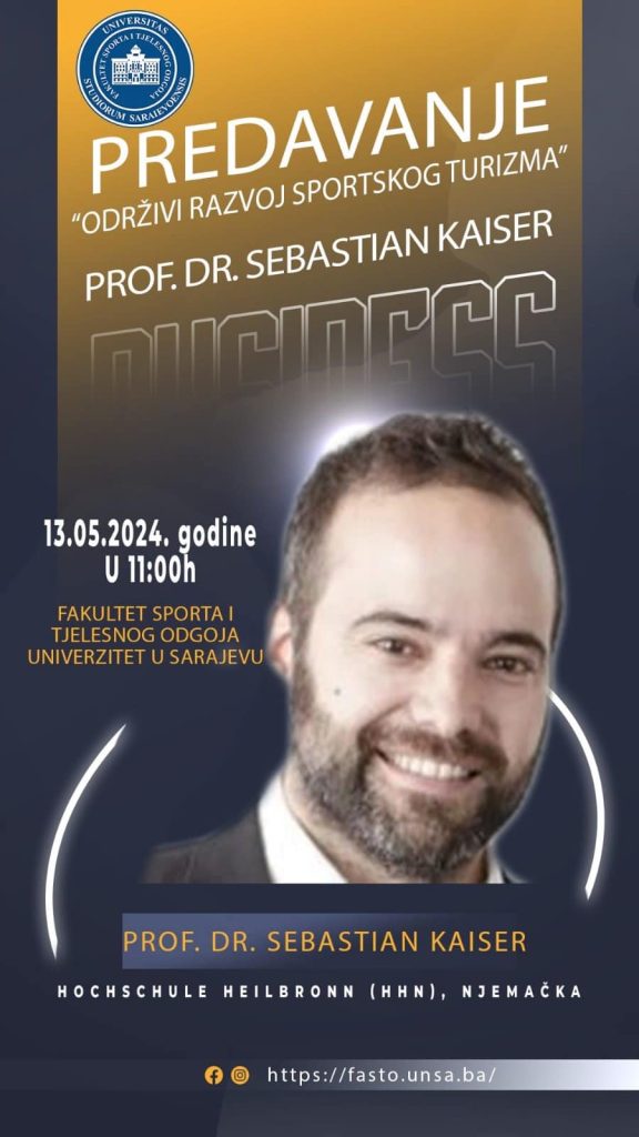 Gostujući profesor na Univerzitetu u Sarajevu – Fakultetu sporta i tjelesnog odgoja Sebastian Kaiser s Univerziteta Heilbronn (Hochschule Heilbronn – University of Applied Sciences - Njemačka), održao je predavanje studentima i nastavnicima 13. maja 2024. godine o temi Sustainable development of tourist destinations, … and the contribution of sporting / cultural events – Challenges and possible solutions using the example of Epidaurus in Greece. Ova posjeta označava početak saradnje između Univerziteta Heilbronn i smjera Menadžment u sportu, sportskom turizmu i rekreaciji Fakulteta sporta i tjelesnog odgoja Univerziteta u Sarajevu.