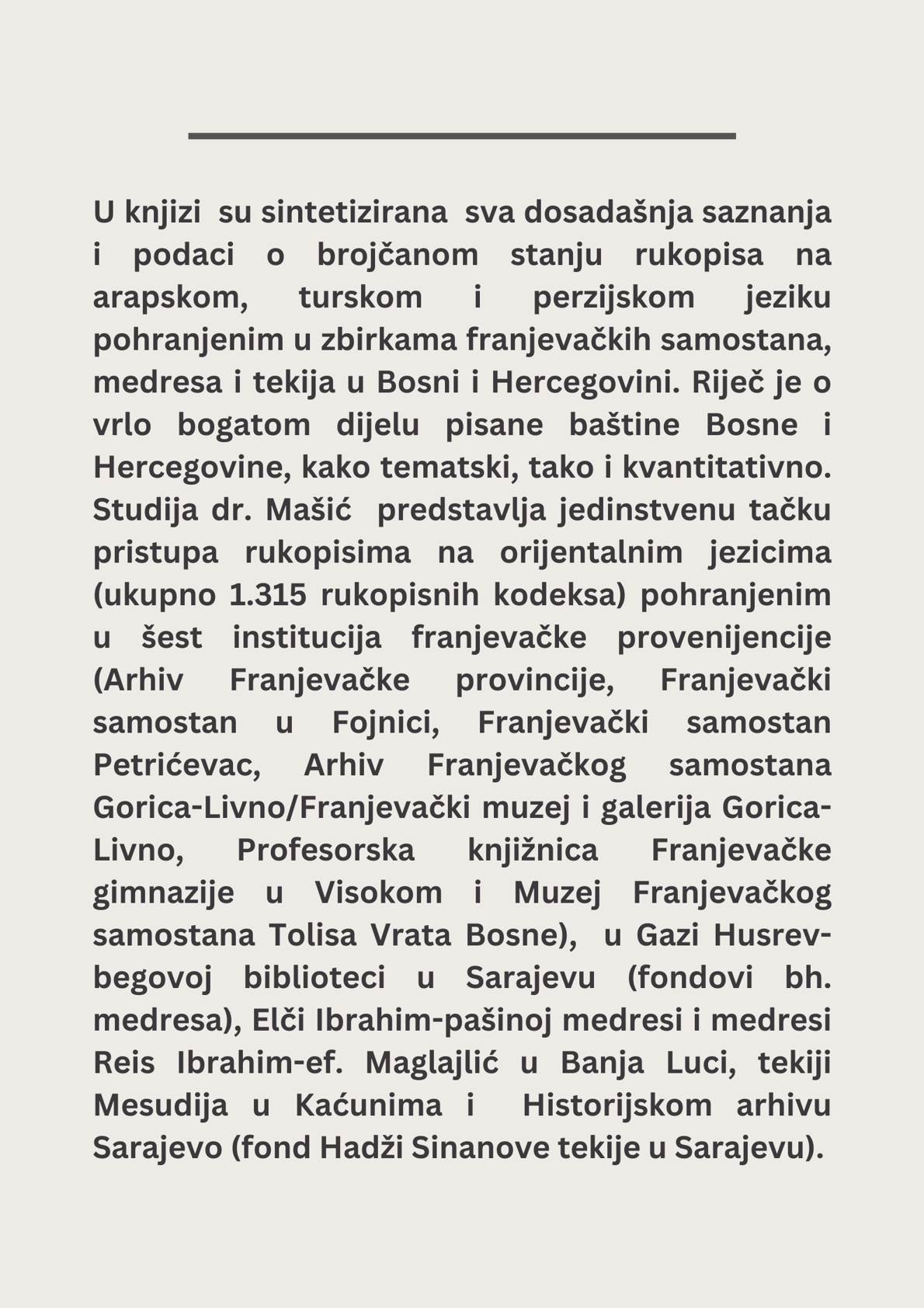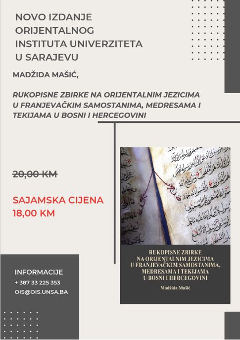 U Sarajevu se u periodu od 9. do 14. aprila održava 36. Međunarodni sajam knjiga i učila pod sloganom „Čitaj me“. Univerzitet u Sarajevu – Orijentalni institut će u okviru Sajma održati promociju knjige dr. Madžide Mašić „Rukopisne zbirke na orijentalnim jezicima u franjevačkim samostanima, medresama i tekijama u Bosni i Hercegovini“. Knjigu će promovisati dr. Dželila Babović a sama promocija će biti održana u četvrtak, 10. aprila 2025. godine u 14 sati u sajamskom prostoru kompleksa „Skenderija“.