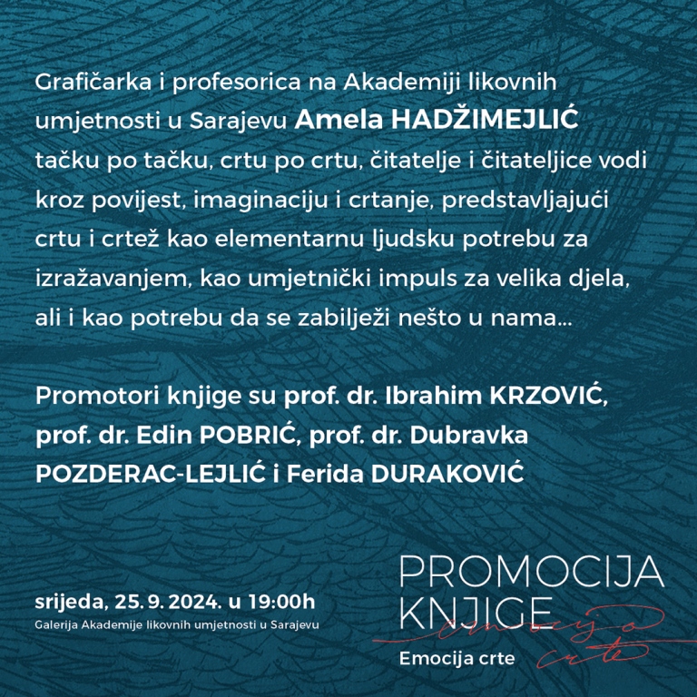 Sa zadovoljstvom vas pozivamo na promociju knjige EMOCIJA CRTE autorice Amele Hadžimejlić