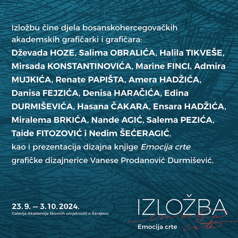 Promocija knjige "EMOCIJA CRTE" autorice Amele Hadžimejlić i izložba bosanskohercegovačkih akademskih grafičarki i grafičara
