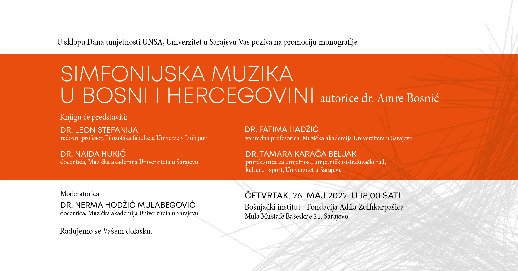 Promocija monografije “Simfonijska muzika u Bosni i Hercegovini”dr. Amre Bosnić će biti upriličena u četvrtak, 26. maja 2022. godine, u 18 sati u Bošnjačkom institutu – Fondacija Adil Zulfikarpašić kao dio programa festivala “Dani umjetnosti UNSA”.