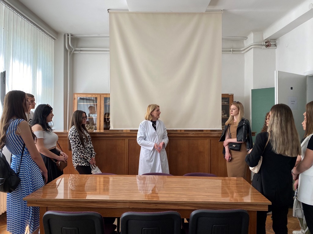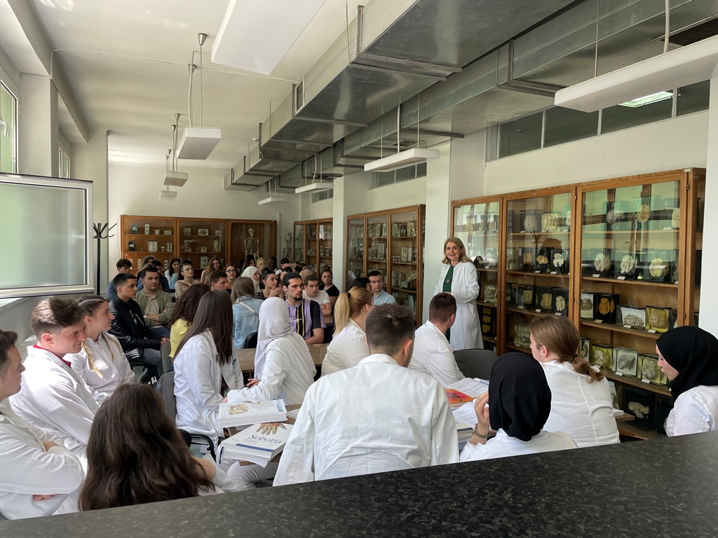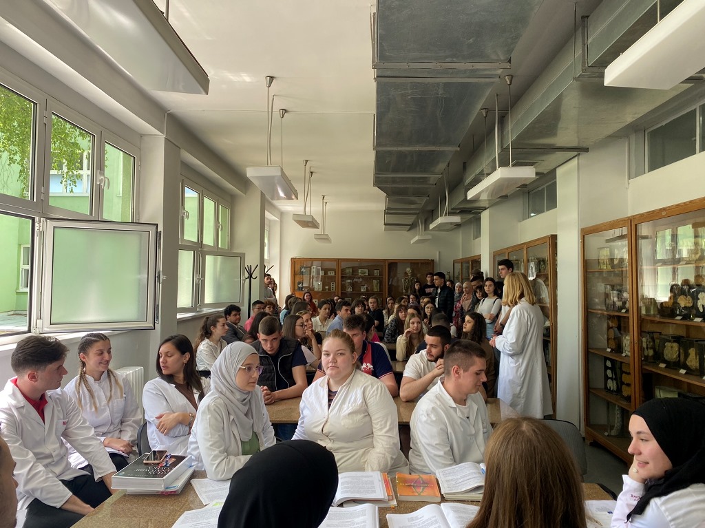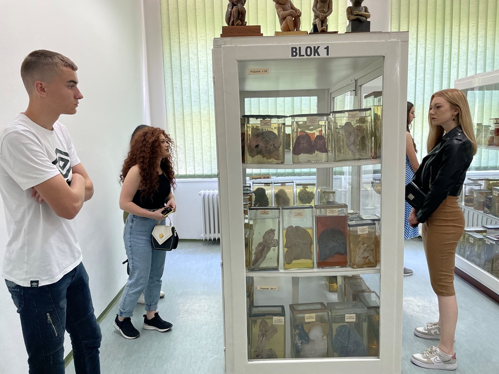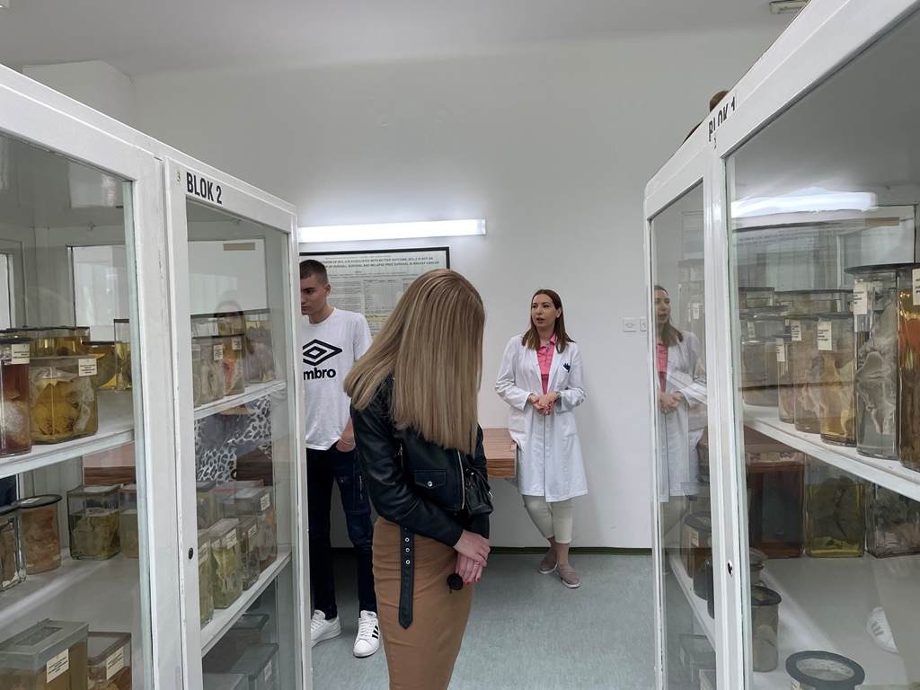 Nakon toga, uslijedile su posjete na Katedri za anatomiju čovjeka, Katedri za patologiju, Katedri za medicinsku mikrobiologiju, parazitologiju i virusologiju, gdje su učenici imali priliku upoznati se sa načinom studiranja na našem Fakultetu kao i sa nastavnim osobljem, prostorima i načinom izvođenja nastave i vježbi.