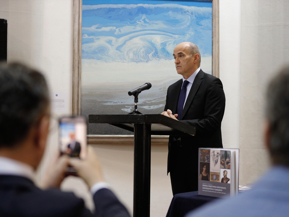 Promociju ove značajne monografije, te izložbu odabranih umjetničkih djela otvorio je rektor Univerziteta u Sarajevu prof. dr. Rifat Škrijelj naglasivši da Univerzitet u Sarajevu obilježavajući 74 godine rada i razvoja slavi bogatstvo umjetničkog nasljeđa. „Nastojali smo očuvati vrijednu kolekciju umjetničkih djela koju smo skupljali s ponosom tokom protekle sedamdeset četiri godine. Ova zbirka nije samo skup umjetničkih djela, već je simbol trajne saradnje, sjećanja na ključne trenutke u historiji naše institucije i izraz naše predanosti umjetnosti“, istakao je rektor Škrijelj te dodao da je prikupljajući umjetnička djela, Univerzitet u Sarajevu izgradio ne samo zbirku umjetničkih djela, već i snažnu vezu s umjetnošću. „Ova ostvarena veza je postala sastavni dio našeg identiteta, obogaćujući našu akademsku zajednicu i inspirišući nas u naučno-istraživačkom i umjetničko-istraživačkom radu“, naveo je rektor Škrijelj. Također, dodao je da ono što čini ovaj događaj posebnim jeste činjenica da je prvi put umjetnička građa Rektorata Univerziteta u Sarajevu procijenjena, sistematizirana i naučno obrađena, te da se rezultat tih napora ogleda upravo u Monografiji i izložbi.