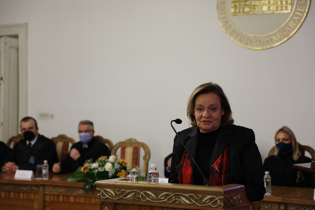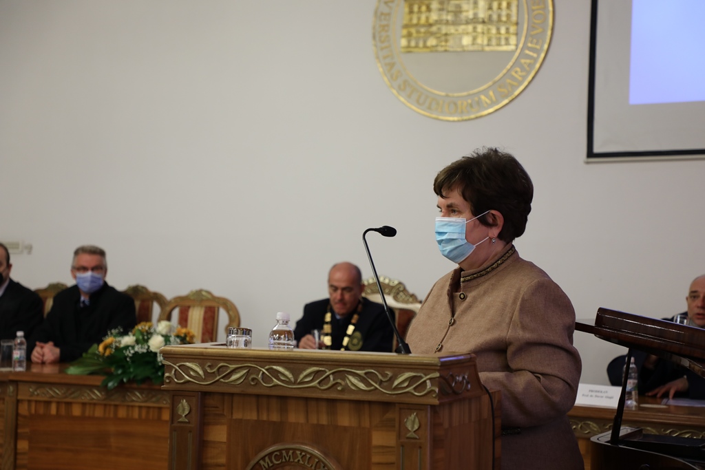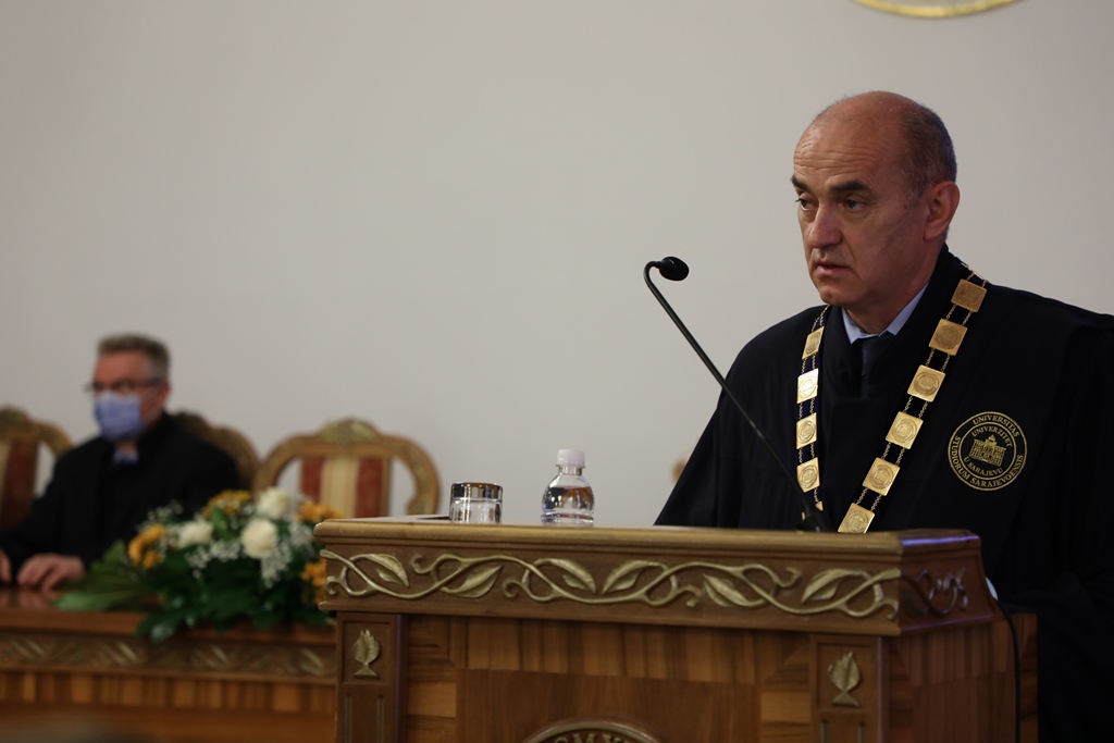 Riječi dobrodošlice prisutnima uputio je prof. dr. Rifat Škrijelj, rektor Univerziteta u Sarajevu naglasivši da posebno mjesto u historiji našeg univerziteta imaju profesori emeritusi koji su svojim djelovanjem i reputacijom zaslužili ovo počasno zvanje. „Ove godine, prema odluci Senata Univerziteta u Sarajevu, počasno zvanje profesor emeritus dobija osam naših uglednih penzionisanih profesora i jedan akademik koji su najveći dio svog radnog vijeka ugradili u Univerzitet. Odgajajući brojne generacije mladih ljudi ovi profesori su ostvarili značajan znanstveni opus, priznat i prepoznatljiv ne samo u užoj oblasti, nego u cijeloj akademskoj zajednici i široj javnosti. Oni su svojim naučnim doprinosom, obilježili vrijeme u kojem su djelovali, te na najbolji način javno afirmirali svoju struku i dali trajni pečat u historiji razvoja Univerziteta“, istakao je rektor Škrijelj.