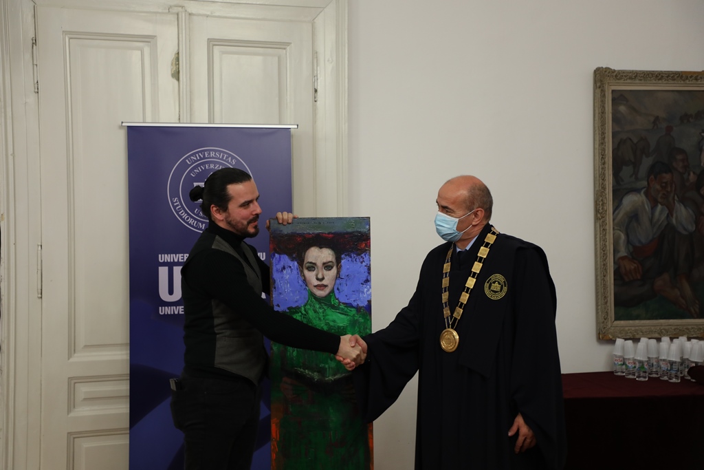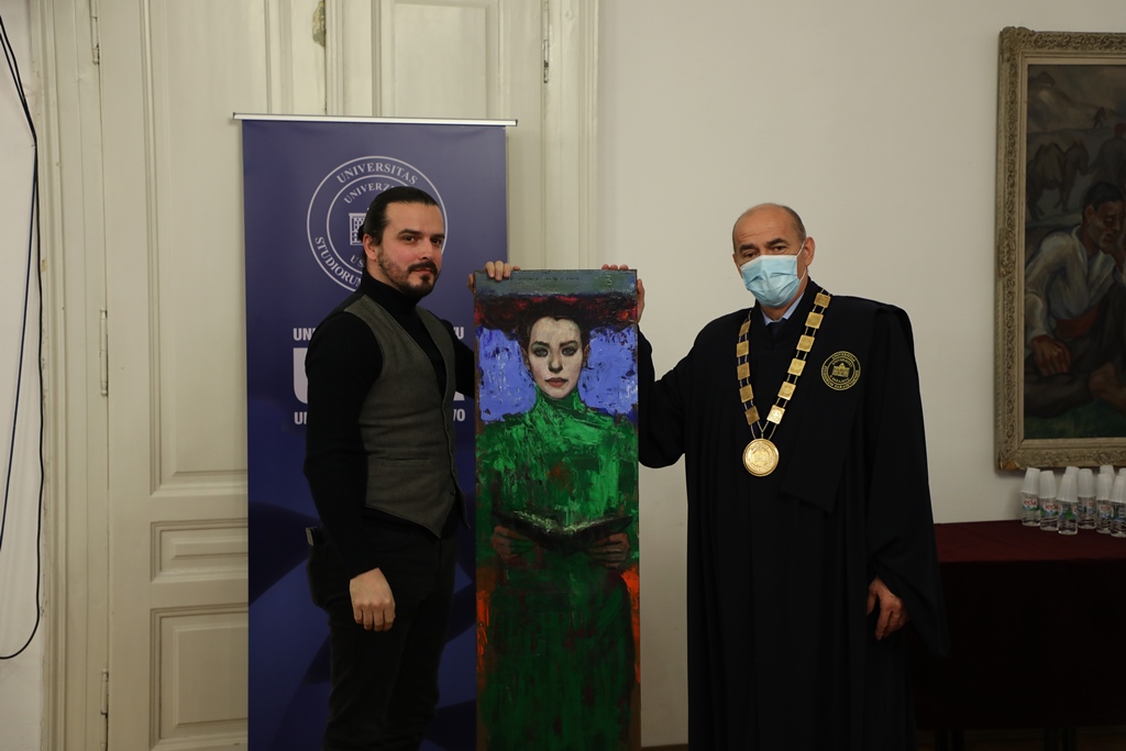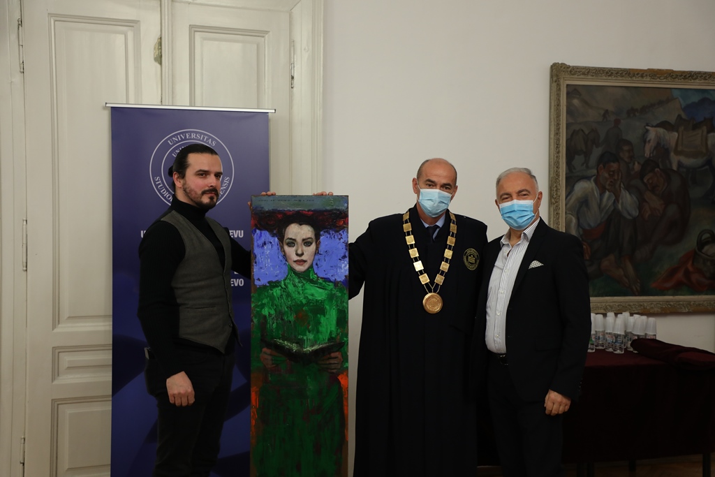 Ovaj svečani trenutak upotpunio je akademski skulptor Adis Lukač koji je magistrirao na Akademiji likovnih umjetnosti Univerziteta u Sarajevu na Odsjeku Skulptura. Autor je značajnih djela kao što su spomenik prvom bosanskom kralju Tvrtku I Kotromaniću u Tuzli, biste narodnom heroju Ivanu Goranu Kovačiću u Sarajevu, reljefa Hasanaginica postavljenom u Narodnom pozorištu u Sarajevu te spomenika velikanu bosanskohercegovačke košarke Mirzi Delibašiću. Akademski skulptor magistar Adis Lukač s velikom ljubavlju, kako sam kaže, Univerzitetu u Sarajevu kao matičnoj kući, odlučio je pokloniti sliku "Karijatida sciencia” jer upravo kao takva - čvrsta, postojana i stabilna “Karijatida znanja” pripada upravo najstarijem i najvećem univerzitetu u Bosni i Hercegovini - Univerzitetu u Sarajevu.