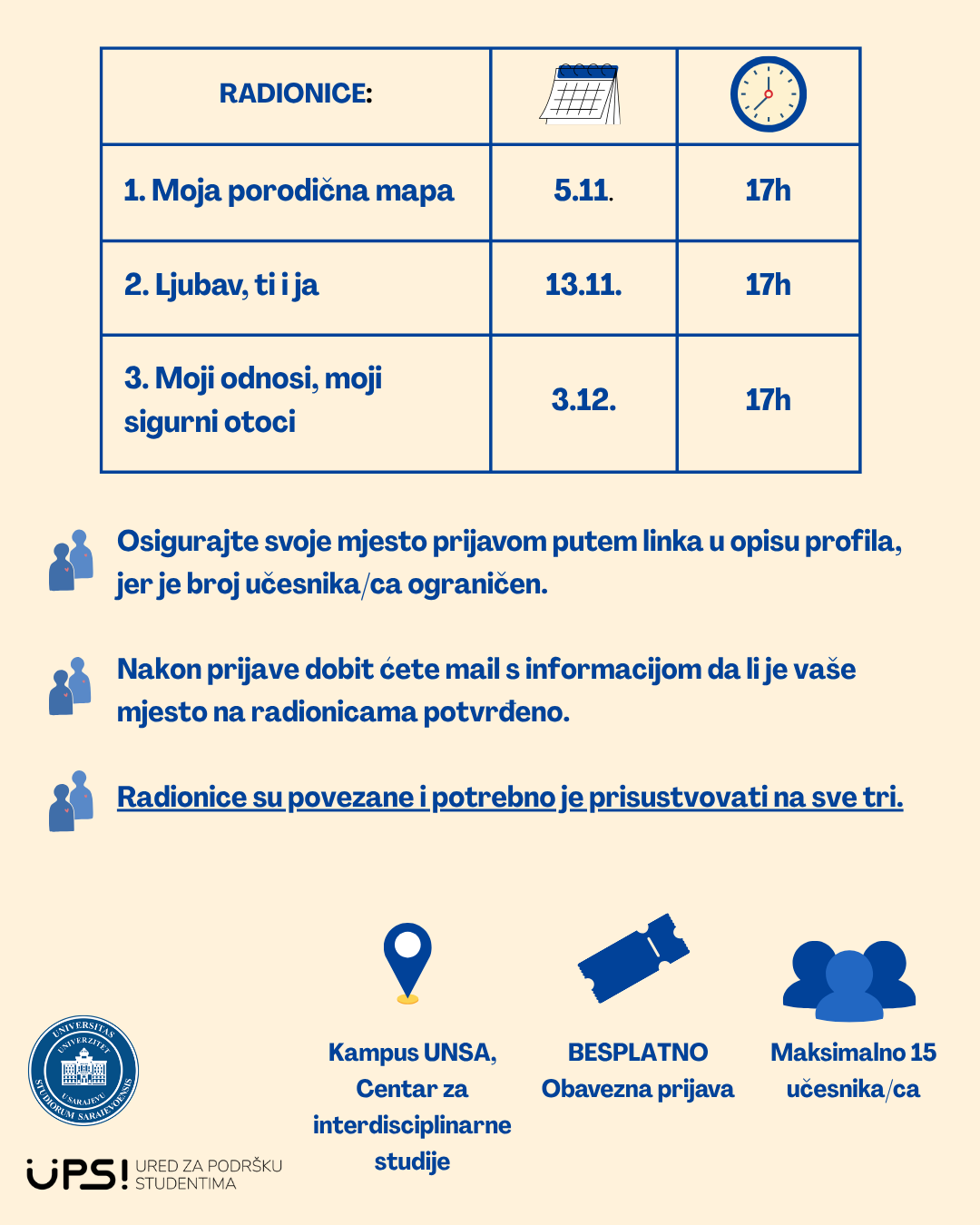 Pozivamo vas na serijal interaktivnih radionica posvećenih boljem razumijevanju sebe kroz sistem odnosa! Kroz tri sesije istražit ćemo šta je to naslijedeno, ali i naučeno kroz porodični sistem, funkcionalnost i disfunkcionalnost partnerskih odnosa, stilove privrženosti, načine prepoznavanja vlastitih uloga i potreba u odnosima te kako odnose učiniti kvalitetnijim.