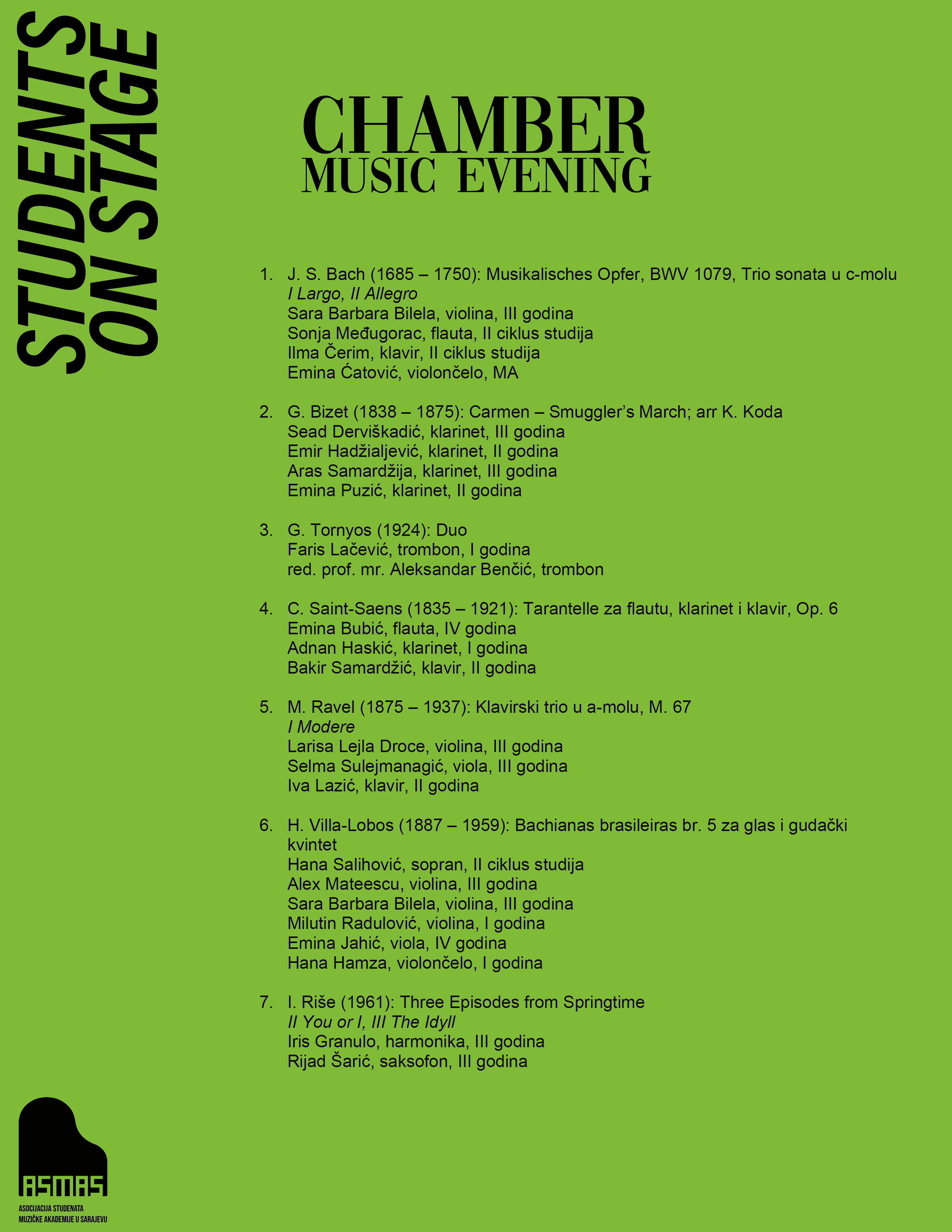 Asocijacija studenata Muzičke akademije u Sarajevu vas poziva na "Chamber Music Evening", prvi aprilski koncert iz ciklusa "Students on Stage".