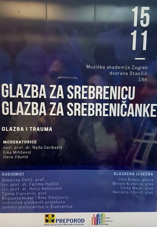 Van. prof. dr. Fatima Hadžić sa Muzičke akademije Univerziteta u Sarajevu održala je predavanje pod nazivom „Muzika za Srebrenicu“ na tribini „Glazba za Srebrenicu, glazba za Srebreničanke, glazba i trauma“, koja je u organizaciji Odsjeka za muzikologiju Muzičke akademije u Zagrebu i Kulturnog društva Bošnjaka Hrvatske „Preporod“ održana 15. novembra 2019. u Dvorani Stančić Muzičke akademije u Zagrebu.