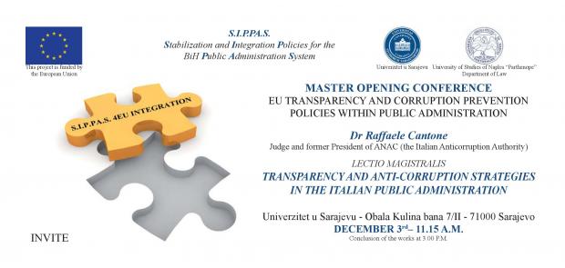 Univerzitetski master-kurs „Politike transparentnosti i prevencije korupcije u okviru javne uprave“ održan je 3. decembra 2019. godine u prostorijama Univerziteta u Sarajevu. Ovaj master-kurs organiziran je u okviru master-programa „Politike stabilizacije i integracije u sistemu javne uprave BiH” – S.I.P.PA.S., koji se održava na Univerzitetu „Parthenope” u Napulju, a podržan je od Evropske komisije – Delegacije Evropske unije u Bosni i Hercegovini.