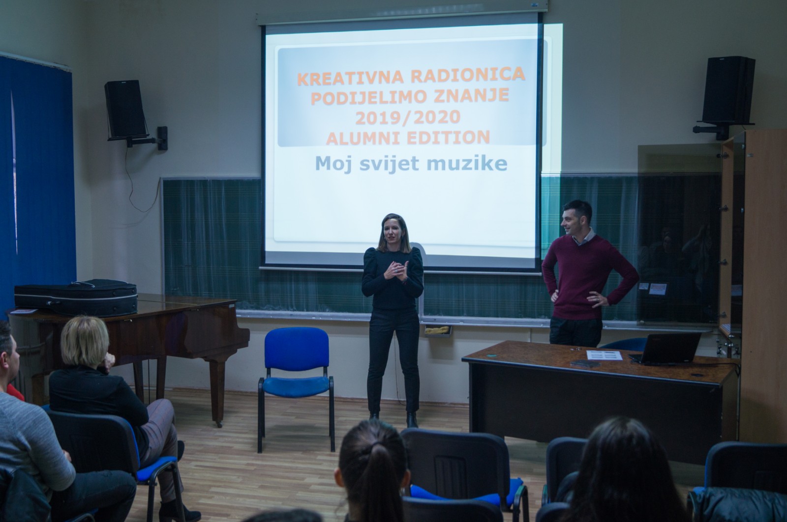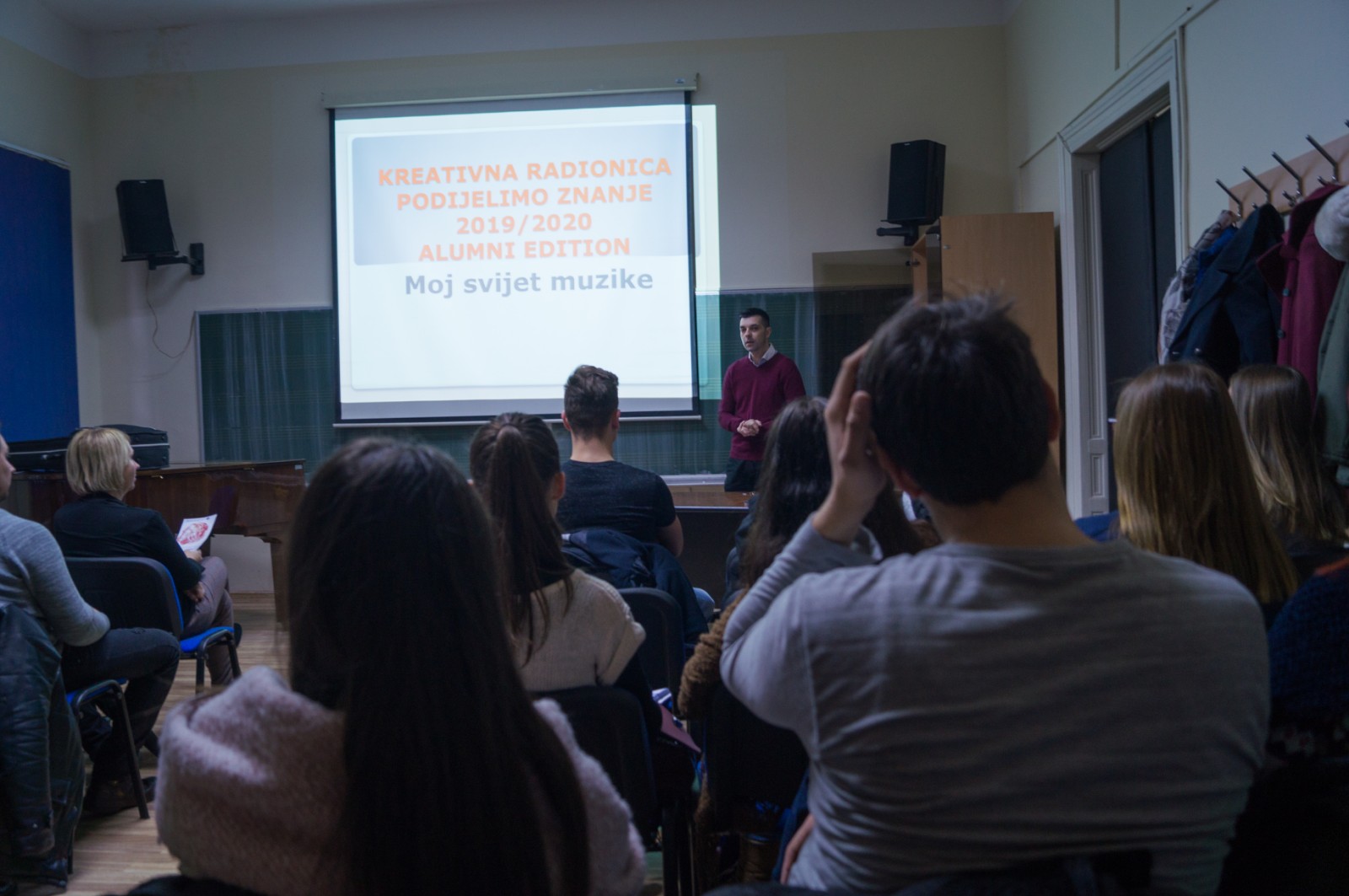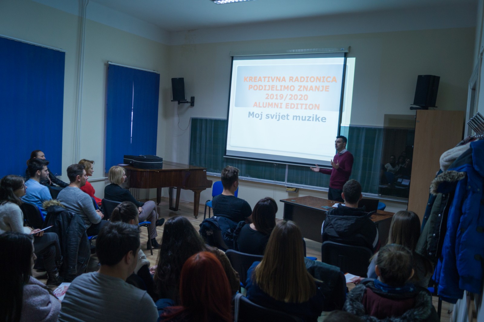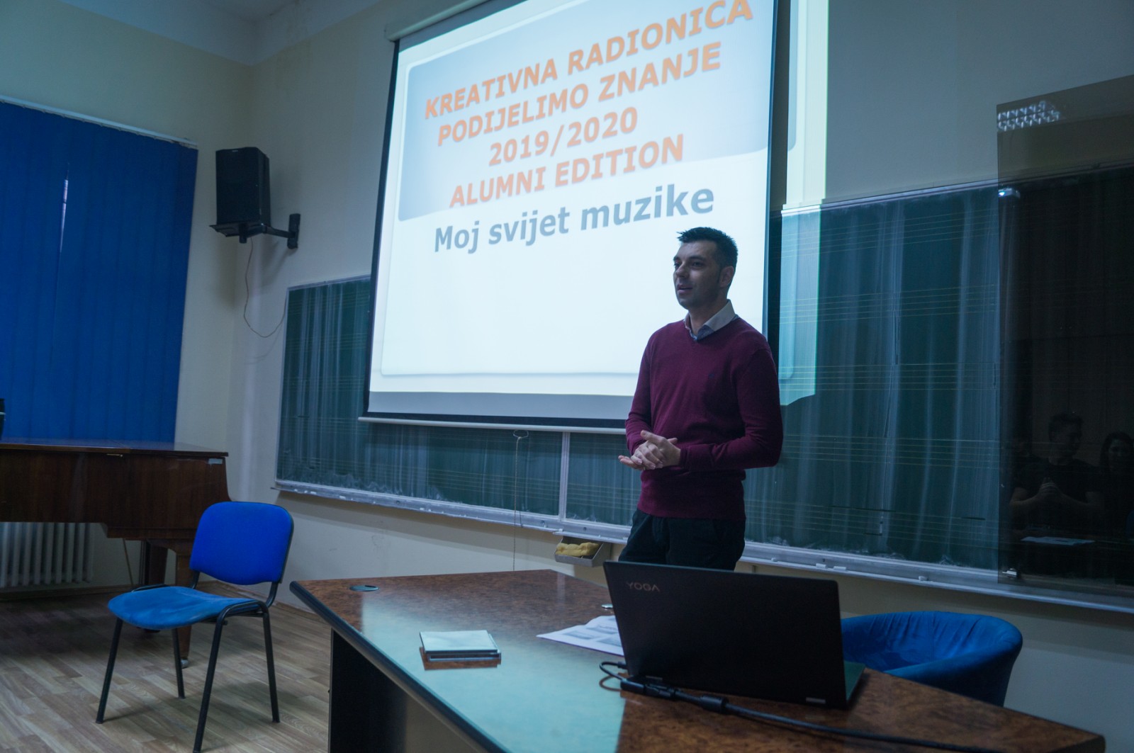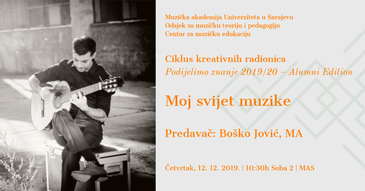Ovogodišnje aktivnosti ciklusa zaokružila je kreativna radionica Podijelimo znanje 2019/20. – Alumni Edition. Sami program ima za cilj obnoviti kontakte s bivšim studentima Muzičke akademije koji su po završetku školovanja uspjeli ostvariti izniman uspjeh u svojim poljima djelovanja, prepoznat u društvima u kojima stvaraju. Njihova iskustva koja su na tom putu stjecali upravo su idealan praktičan prikaz potrebe i nužnosti pojedinca za cjeloživotnim učenjem, na koje projekt i želi ukazati. Stoga smo 12. 12. 2019. ugostili alumnija MAS Boška Jovića, MA, koji je na Muzičkoj akademiji u Sarajevu održao dvosatno predavanje o temi Moj svijet muzike, ponudivši prisutnima uvid u detalje uspona svoje karijere gitariste, označene brojnim solističkim koncertima i saradnjom s najpoznatijim muzičkim umjetnicima BiH, regije i svijeta.