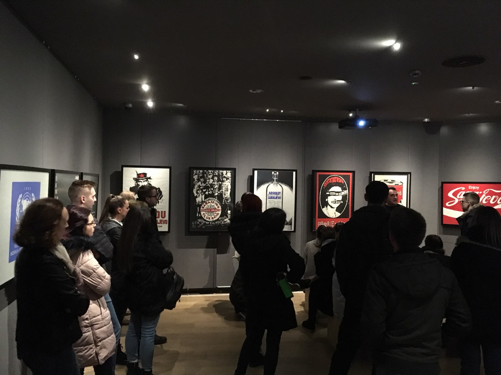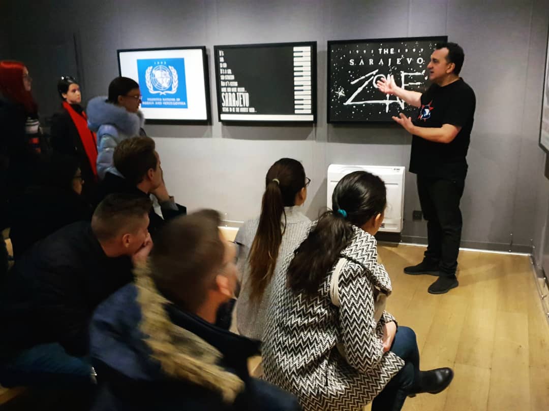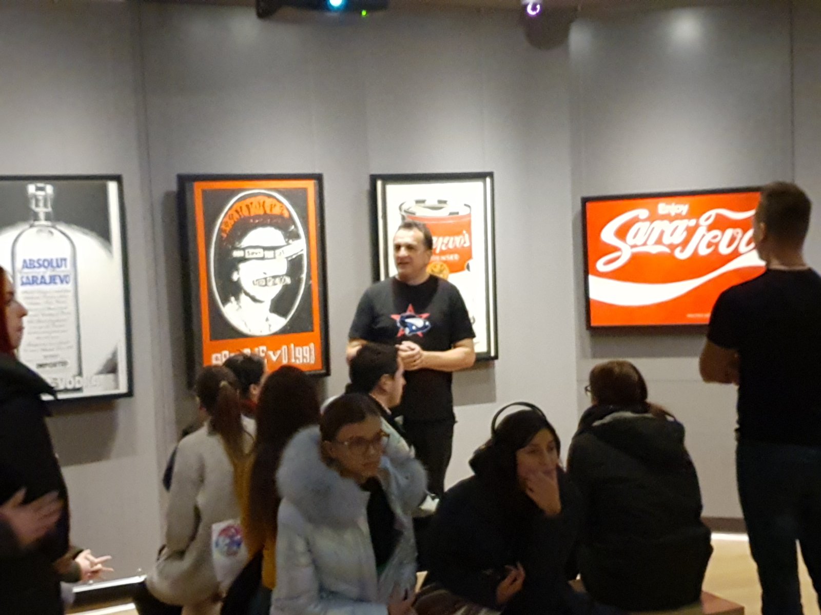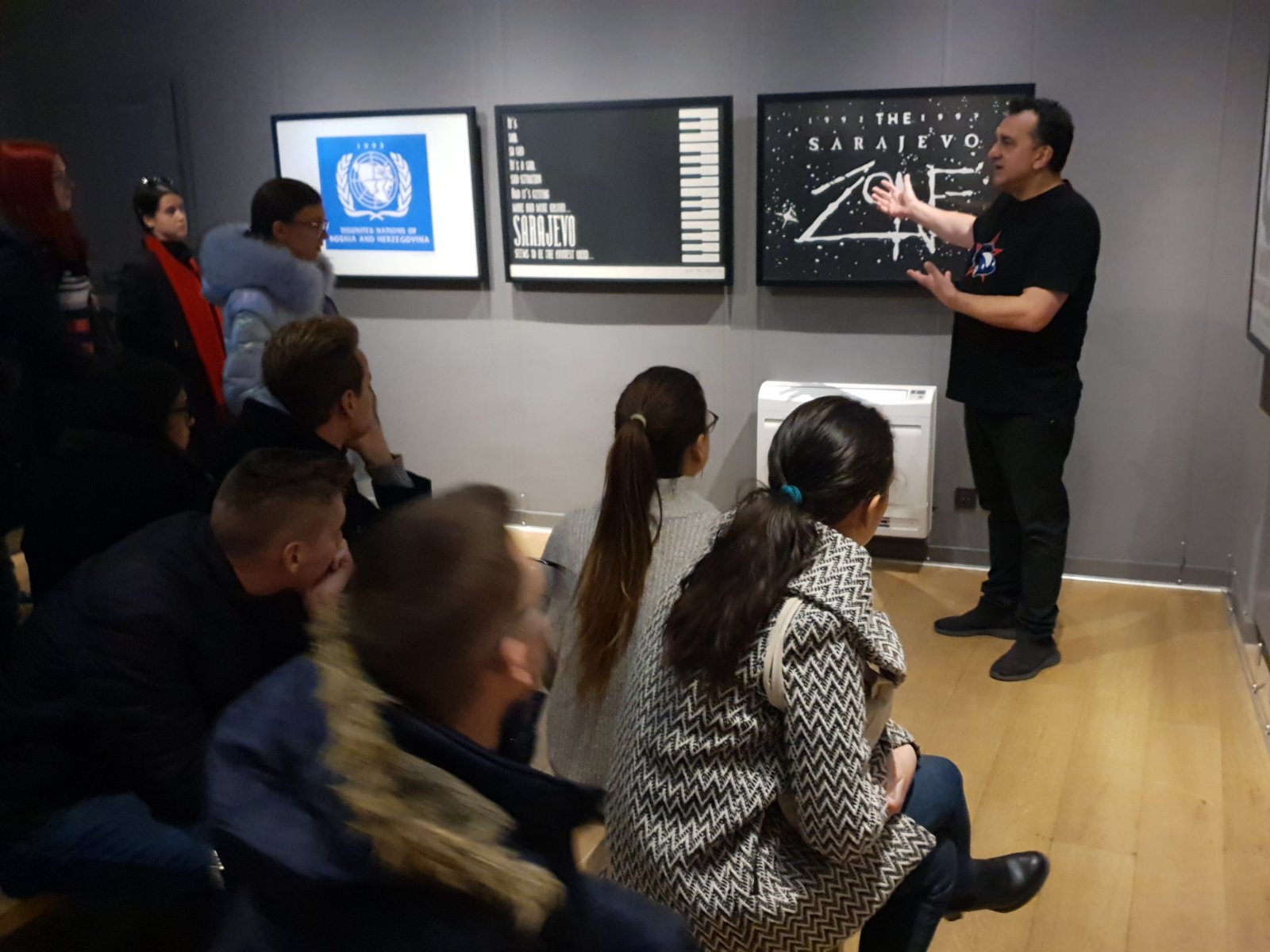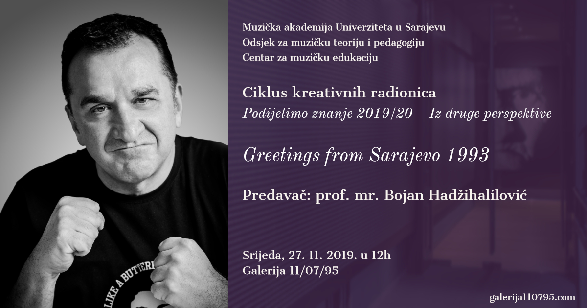 Uporedo s navedenim, realizirana je i kreativna radionica Podijelimo znanje: Iz druge perspektive, čiji programski okvir studentima Muzičke akademije želi obezbijediti kreativno okruženje za prepoznavanje i produbljivanje njihovih ideja i interesa izvan akademskim programom zadatog prostora, a kroz saradnju s profiliranim umjetnicima i naučnicima s drugih srodnih institucija (akademija umjetnosti, fakulteta, instituta za umjetničko/naučno istraživanje, umjetničkih galerija, medijskih i izdavačkih kuća). Jedan od ciljeva je i potaknuti studente na kritičko, kreativno mišljenje o pozicijama umjetnika, teoretičara umjetnosti i pedagoga u društvu, kao onih koji ukazuju na nužne promjene, iniciraju ih i ulažu u njihovu realizaciju, dok pritom brižljivo čuvaju općeljudske vrijednosti na kojima društvo počiva i odgovorno ih prenose novim generacijama. Stoga smo u ovom izdanju kreativne radionice Podijelimo znanje 2019/20.: Iz druge perspektive pozvali prof. mr. Bojana Hadžihalilovića, grafičkog dizajnera i jednog od idejnih tvoraca antologijskog djela Greetings from Sarajevo 1993, koje je i bilo u fokusu njegovog predavanja namijenjenog studentima MAS 27. 11. 2019. godine. Predavanje je održano u prostoru Galerije 11/07/95, koja, pored toga što već godinama zauzima suverenu poziciju u kulturi sjećanja na genocid u Srebrenici u julu 1995. godine, snažno odašiljući poruke o pogubnosti rata, pogubnosti ravnodušja spram njega i šutnje i zaborava nakon njega, nudi stalnu postavku navedenog Hadžihalilovićevog djela. Uvod u samo predavanje kroz obilazak Galerije kuratorice Anele Hakalović ukazao je na jedan od najvažnijih konteksta sagledavanja umjetničkog djela – njegove uloge u bosanskohercegovačkom društvu.