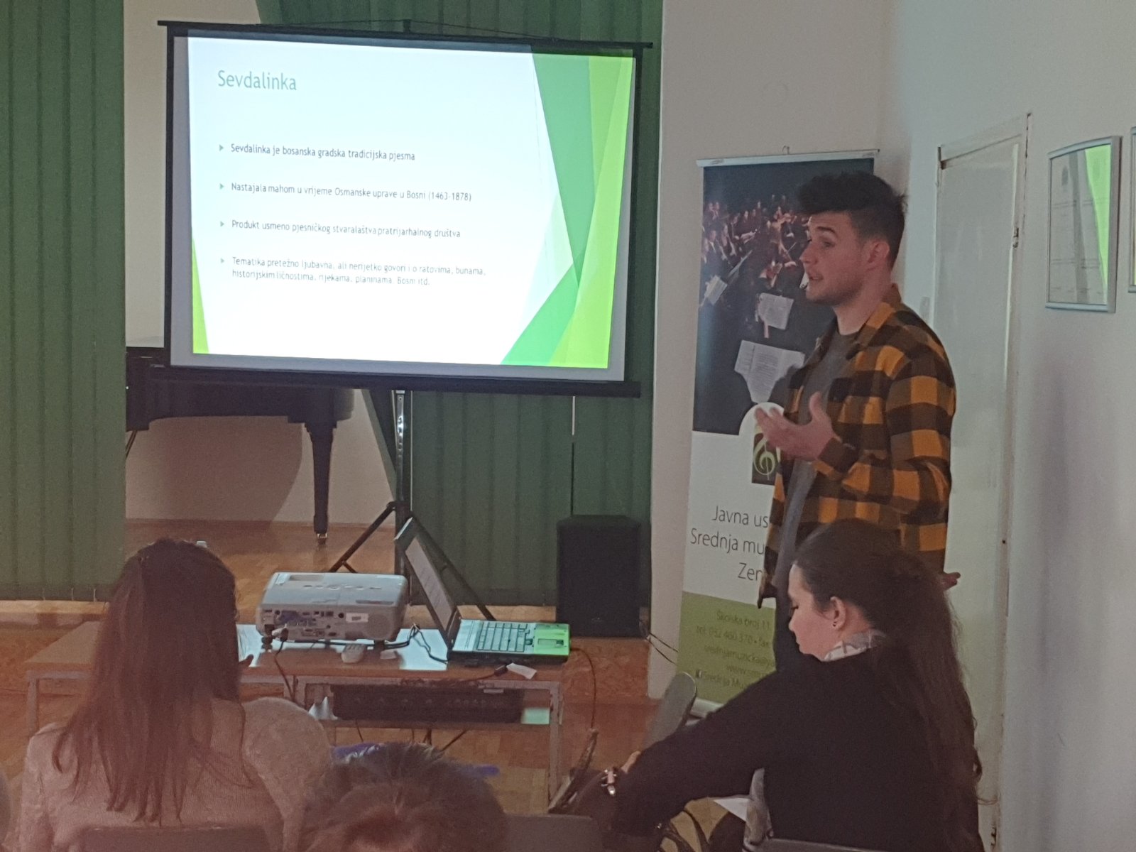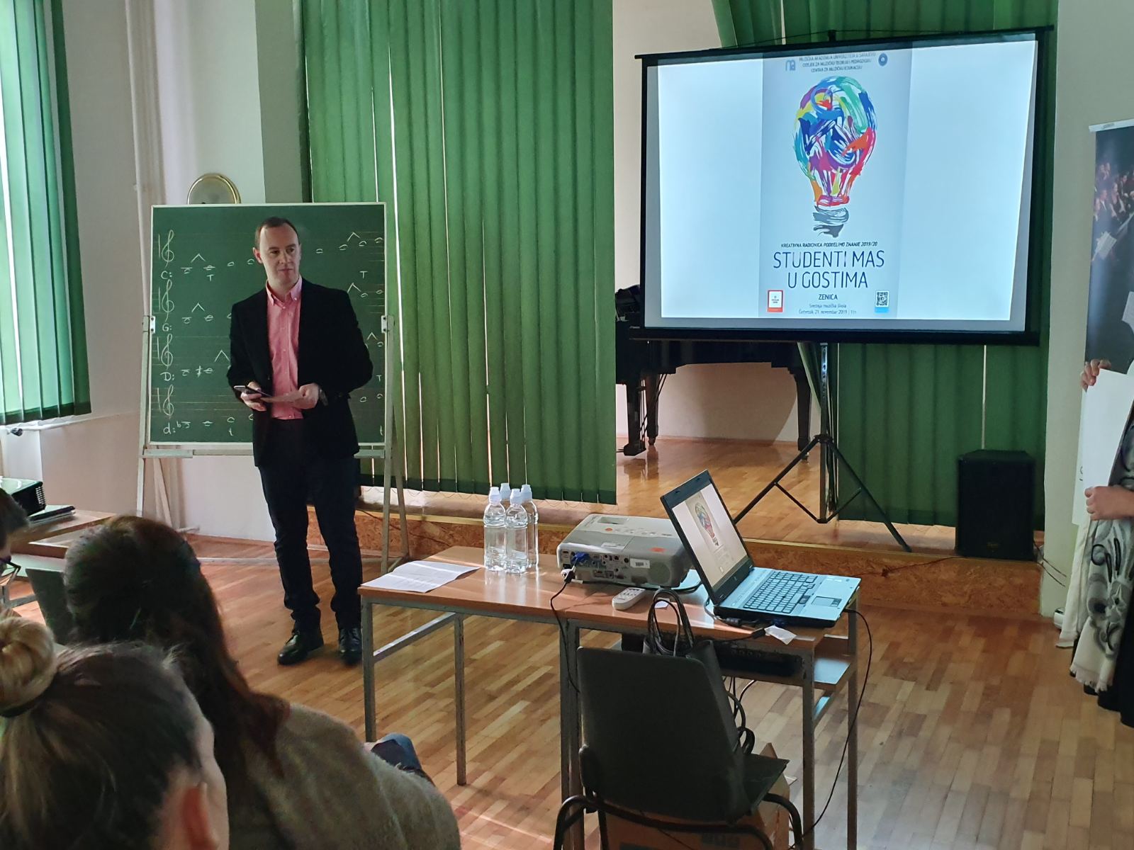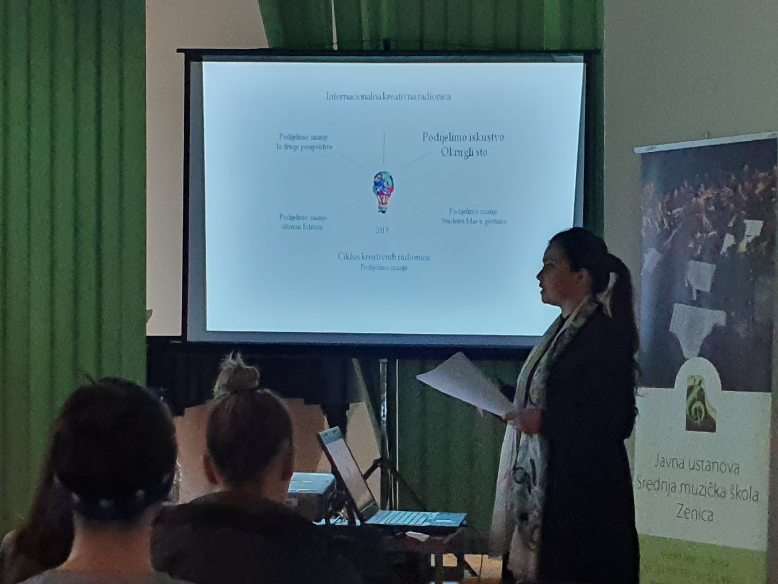 Novu školsku godinu započeli smo realizacijom prvog dijela programskog okvira ciklusa pod nazivom kreativna radionica Podijelimo znanje 2019/20. – studenti MAS u gostima. Radionica je uspješno provedena u periodu od septembra do novembra 2019. godine posjetama Drugom međunarodnom forumu studenata scenskih umetnosti u Beogradu, Srednjoj muzičkoj školi I i II stupnja i Srednjoj glazbenoj školi Ivana pl. Zajca u Mostaru, te Srednjoj muzičkoj školi u Zenici. Cilj programa ove radionice, čije će naredno izdanje biti realizirano u martu i aprilu 2020. godine posjetama Bihaću, Banjoj Luci i Novom Travniku, jeste unaprijediti saradnju s kolegama profesorima i učenicima muzičkih akademija i srednjih muzičkih škola u drugim gradovima Bosne i Hercegovine i inozemstvu, upoznati ih s aktivnostima projekta, te razmijeniti s njima znanja i iskustva o oblastima muzičkog djelovanja. Drugi forum studenata scenskih umetnosti, u organizaciji studenata Fakulteta muzičke umetnosti Univerziteta umetnosti u Beogradu, održan je u Kancelariji za mlade Vračar u Beogradu 26. 09. 2019. godine. Svojim temama iz oblasti solfeggia i metodike muzičke nastave predstavili su se studenti Odsjeka za muzičku teoriju i pedagogiju Silvana Jakupović (V godina), Ana-Marija Tomić (IV godina) i Damir Dajić (V godina). Mostarsko izdanje radionice, koje se 19. 11. 2019. održalo u prostorijama Srednje glazbene škole Ivana pl. Zajca u Mostaru, ujedinjujući učenike obiju mostarskih srednjih muzičkih/glazbenih škola, predvodio je voditelj projekta red. prof. dr. Refik Hodžić, koji je u okviru jednosatnog predavanja govorio o metodičkom diskursu u nastavi harmonije. Pratile su ga studentice Odsjeka za muzičku teoriju i pedagogiju MAS Silvana Jakupović, Ana-Marija Tomić i Jelena Stipić (IV godina), te teorijski (Jakupović) i praktično predstavile programske okvire ciklusa razmatranjem problema muzičke teorije i pedagogije poput analitičkog pristupa Petoj simfoniji L. van Beethovena (Stipić) ili mogućnosti interaktivne aplikacije predmeta muzičke teorije i pedagogije u formi mjuzikla (Tomić). Na radionici u Zenici 21. 11. 2019. godine predstavili su se asistentica Odsjeka za muzičku teoriju i pedagogiju Ena Plakalo, MA, izlaganjem o viziji i dosadašnjim iskustvima ciklusa, te studenti Odsjeka za muzičku teoriju i pedagogiju Damir Dajić, kao i Odsjeka za muzikologiju i etnomuzikologiju Rijad Kaniža (IV godina) i Zanin Berbić (V godina), koji su pokazali kreativne prezentacije svojih ideja o muzičkim fenomenima poput modulacije u solfeggiu (Dajić), konceptu Musique concrète (Kaniža) ili improvizaciji u sevdalinci (Berbić).