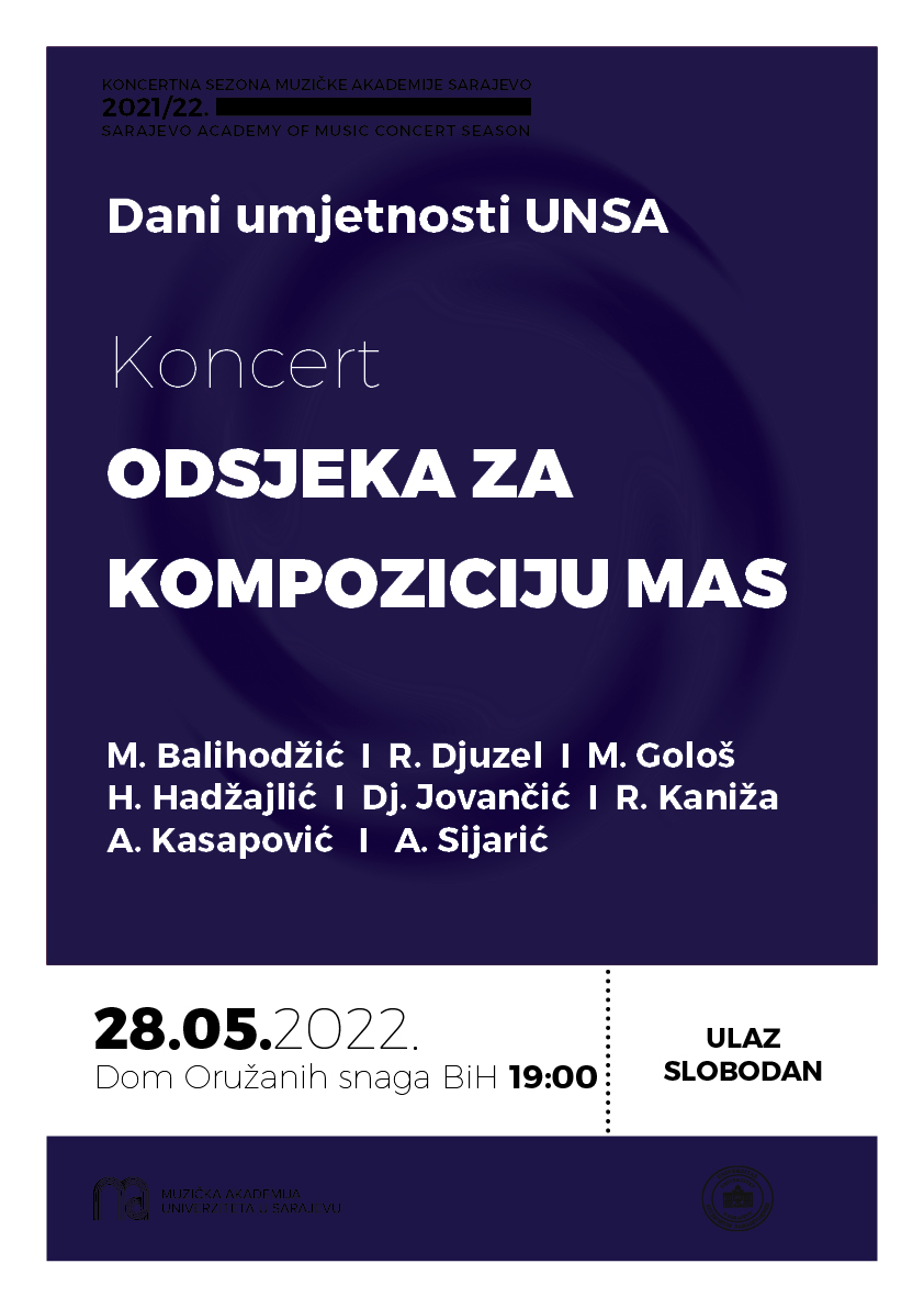 Program festivala “Dani umjetnosti” će biti zaokružen koncertom Odsjeka za kompoziciju Muzičke akademije UNSA koji će se održati večeras u 19 sati u Domu Oružanih snaga BiH. Na programu će se naći kompozicije Roka Đuzela, Moamera Balihodžića, Rijada Kaniže, Mirze Gološa, Azura Kasapovića, Hanan Hadžajlić, Đorđa Jovančića i Ališera Sijarića.