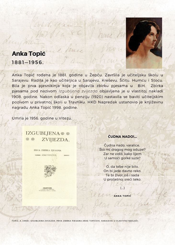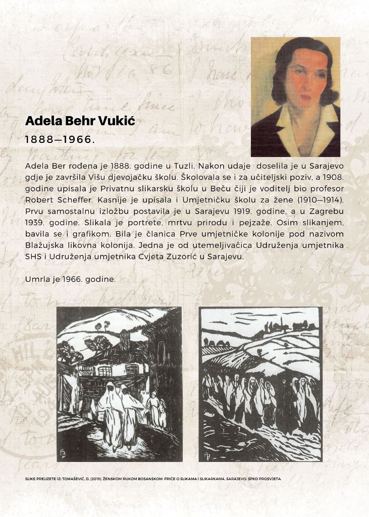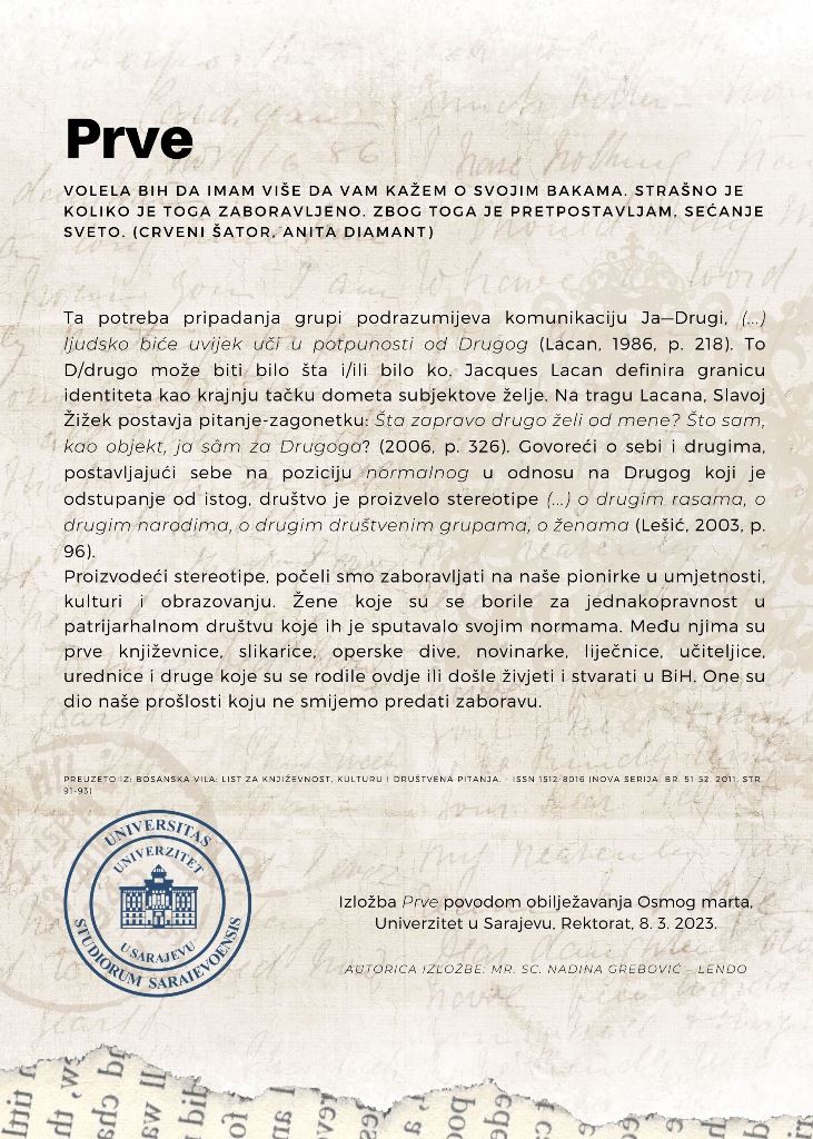 Izložba Prve autorice mr. sc. Nadine Grebović-Lendo predstavila je devet žena iz bosanskohercegovačke historije. Među njima su prve književnice, slikarke, operske dive, novinarke, liječnice, učiteljice, urednice i druge koje su se rodile ili došle živjeti i stvarati u Bosni i Hercegovini.