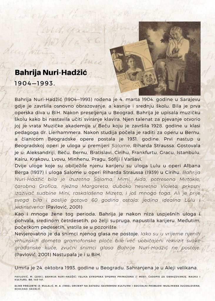 Prof. dr. Fatima Hadžić, govorila je o još jednoj izuzetno značajnoj ženi u historiji Bosne i Hercegovine. Riječ je o Bahriji Nuri Hadžić, prvoj bosanskohercegovačkoj primadoni, koja je karijeru gradila na svjetskom nivou, još davnih 1930-ih godina. Rođena u uglednoj sarajevskoj porodici, Bahrija Nuri Hadžić se školovala u Beogradu i Beču, nastupala je na mnogim evropskim operskim pozornicama, a njena karijera je za samo deset godina dostigla svoj vrhunac.