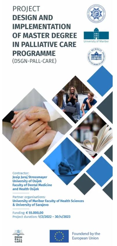 Uvodnom konferencijom održanom 14. marta 2022. godine u Mariboru svečano je otvoren projekt „Design and Implementation of Master Degree in Palliative Care“, nositelja Fakulteta za dentalnu medicinu i zdravstvo Osijek u sastavu Sveučilišta Josipa Jurja Strossmayera u Osijeku. Projekt je financiran sredstvima Europske komisije putem poziva ERASMUS-EDU-2021-EMJM-DESIGN, na koji je prijavljeno 148 projekata iz područja visokog obrazovanja institucija država članica Europske unije, a projekt Fakulteta za dentalnu medicinu i zdravstvo Osijek ostvario je visoko 11. mjesto od ukupno 48 projekata kojima je odobreno financiranje. Ukupni proračun projekta iznosi 55.000 EUR.