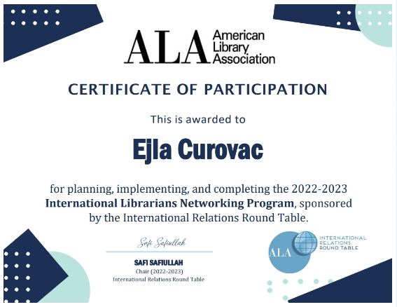 Uposlenica Gazi Husrev-begove biblioteke, magistrica Ejla Ćurovac bila je ovogodišnja učesnica International Librarians Networking programa Američkog bibliotečkog društva (ALA). Program ILNP modeliran je prema programu Međunarodne mreže bibliotekara (ILN) s ciljem pomaganja bibliotekarima iz cijelog svijeta da se umreže i prošire svoje vještine u bibliotekarstvu kroz program saradnje i razmjene iskustava. Ovaj program je osmišljen da bude samovođen, dopuštajući sudionicima da uspostave međusobnu saradnju tijekom četiri mjeseca trajanja programa. U grupi sa našom uposlenicom su bili Drew Damron, bibliotekar iz SAD-a koji je zaposlen u biblioteci u Tokiu i Ufaira Yaseen Shah, bibliotekarka iz Indije, a voditeljica grupe i koordinatorica je bila Muzhgan Nazarova sa Univerziteta u Illinoisu.