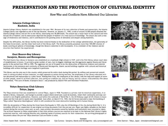 Prilikom razmjene iskustava članovi ove grupe su odlučili predstaviti svoje biblioteke kroz poster pod nazivom “Preservation and the protection of cultural identity” na kojem je predstavljena i Gazi Husrev-begova biblioteka u ratnom periodu. Nakon uspješno završenog projekta, učesnici su dobili certifikate i posteri su objavljenina SlideShare-u Američkog bibliotečkog društva.