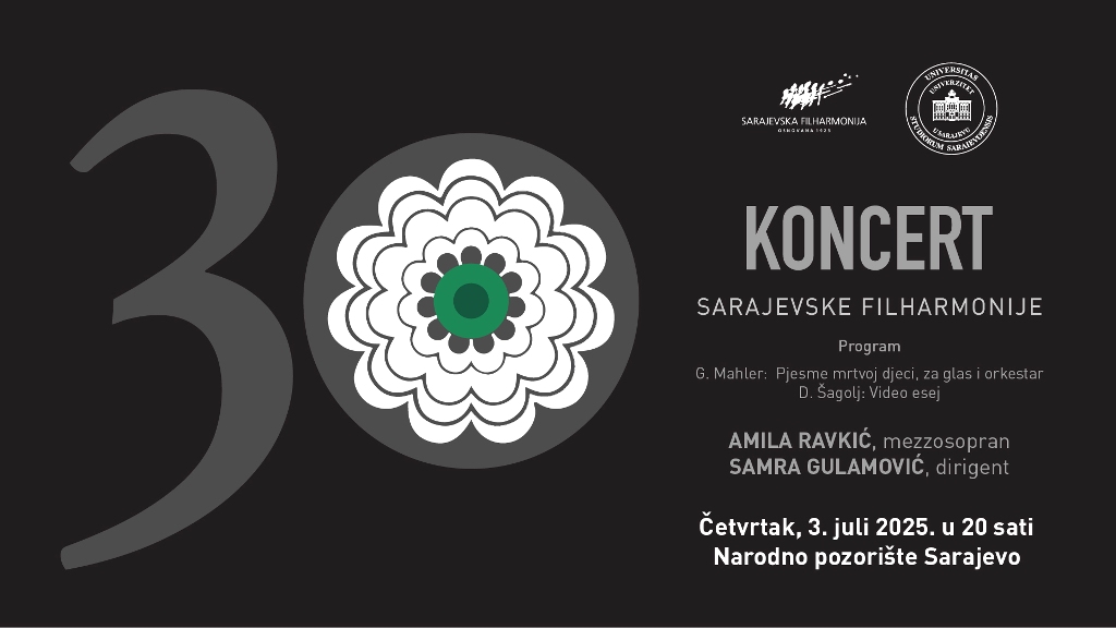 Za 3. juli je zakazan koncert Sarajevske filharmonije u Narodnom pozorištu sa početkom u 20:00 sati. Na ovom posebno emotivnom koncertu bit će izvedeno djelo "Kindertotenlieder" (Pjesme mrtvoj djeci) slavnog kompozitora Gustava Mahlera – ciklus pjesama koje na snažan i potresan način izražavaju bol roditeljskog gubitka i krhkost ljudskog života. Orkestar predvodi maestra Samra Gulamović, a kao solistica nastupit će mezzosopranistica Amila Ravkić. Ovom prilikom bit će prikazan i video esej u režiji Danisa Tanovića koji kombinira fotografije Damira Šagolja s poezijom Faruka Šehića. Koncertom se odaje počast ne samo djeci stradaloj u srebreničkom genocidu, već i djeci koja su stradala u ratovima i sukobima širom svijeta. Koncert je završnica Međunarodne naučne konferencije „Srebrenica 30 godina poslije genocida: sjećanje, odgovornost i izazovi negiranja" koju organizira Univerzitet u Sarajevu u okviru projekta “Odgovornost za budućnost”.