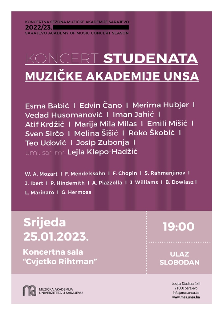 Januarski repertoar Koncertne sezone Muzičke akademije Univerziteta u Sarajevu (MAS UNSA) će biti zaokružen koncertom studenata MAS koji će se održati u srijedu, 25. januara 2023. godine, u 19 sati u Koncertnoj sali "Cvjetko Rihtman”.
