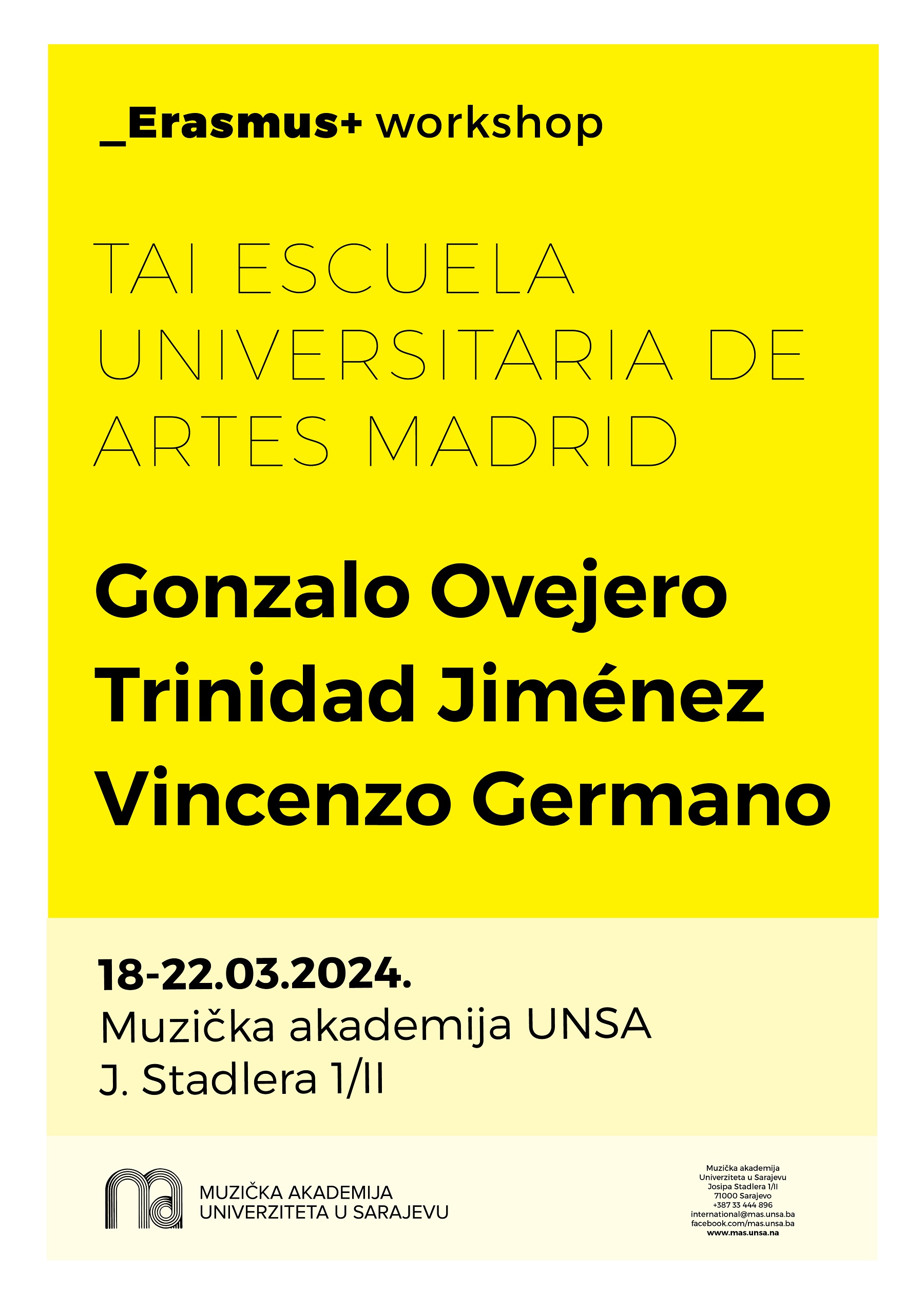 Muzička akademija Univerziteta u Sarajevu najavljuje gostovanje profesora Vincenza Germana, Trinidad Jiménez i Gonzala Ovejera sa Univerziteta umjetnosti TAI Madrid. U periodu od 18. do 22. marta 2024. oni će biti gosti Odsjeka za kompoziciju MAS te održati seriju radionica iz oblasti tehnika i modela muzičke, vizuelne, elektroničke i elektroakustičke improvizacije za studente Muzičke akademije i Akademije likovnih umjetnosti UNSA. Gostovanje se realizira se u okviru programa Erasmus+.