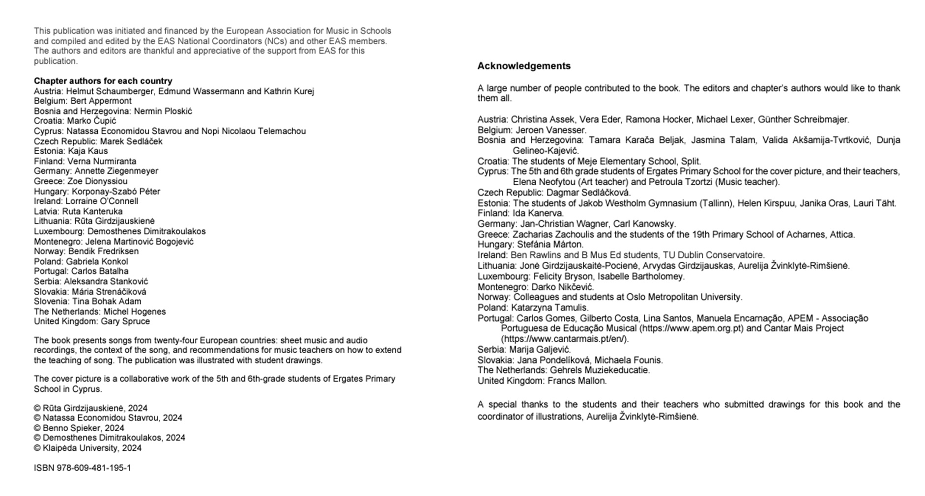 Svečano obilježavanje završeno je zvaničnom objavom publikacije pod naslovom “Unique and United in Music”, od strane Evropske asocijacije za muziku u školama. Knjiga sadrži 24 tradicionalne pjesme iz 24 evropske države a je namijenjena svim muzičkim pedagozima i njihovim učenicima, a sastoji se od notnih zapisa i opisa pjesama, tekstova pjesama sa prevodom na engleski jezik, zvučnih zapisa i metodičkih uputa za nastavnike. Urednici publikacije su Rūta Girdzijauskienė, Natassa Economidou Stavrou, Benno Spieker i Demosthenes Dimitrakoulakos.