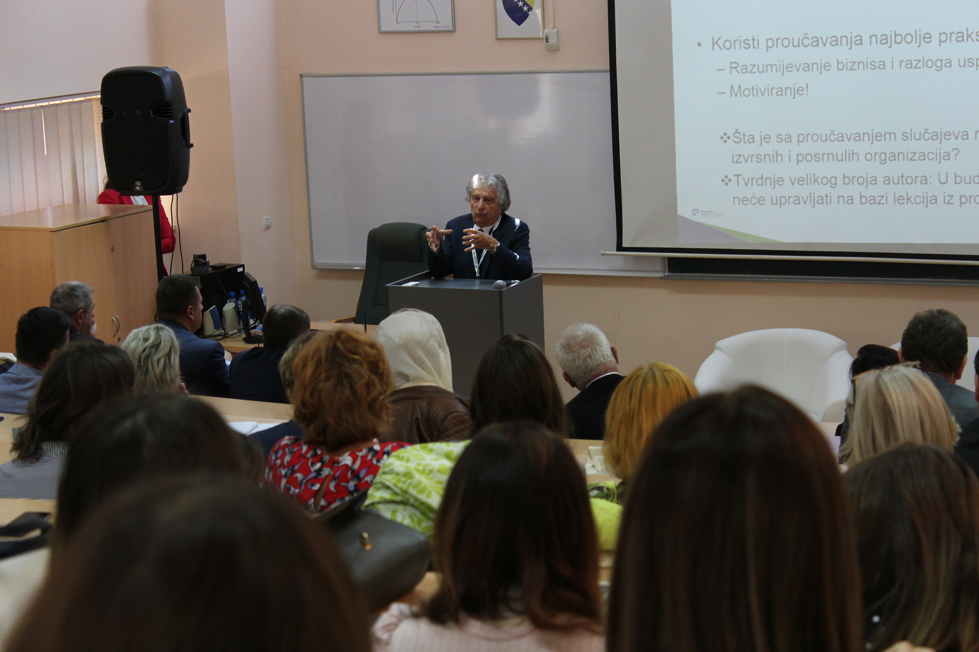 Svoje izlaganje profesor Muratović je završio promišljanjima o ključnim pitanjima struke: Šta trebamo učiti studente i privrednike? Kakav sadržaj trebaju imati udžbenici menadžmenta? Kakve uloge dati najsposobnijima da bismo ih regrutirali i zadržali? Kako osigurati stalnu transformaciju procesa, alata i organizacije na operativnom nivou koji je sve više i strateški?