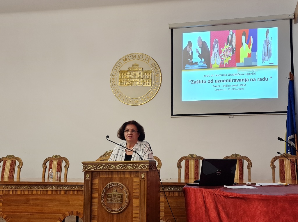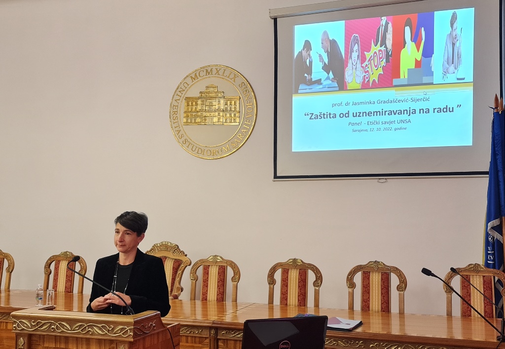 Na Univerzitetu u Sarajevu je, u srijedu 12. oktobra, održan panel pod nazivom “Zaštita od uznemiravanja na radu”, a ovoj temi govorila je prof. dr. Jasminka Gradaščević-Sijerčić sa Pravnog fakulteta UNSA.
