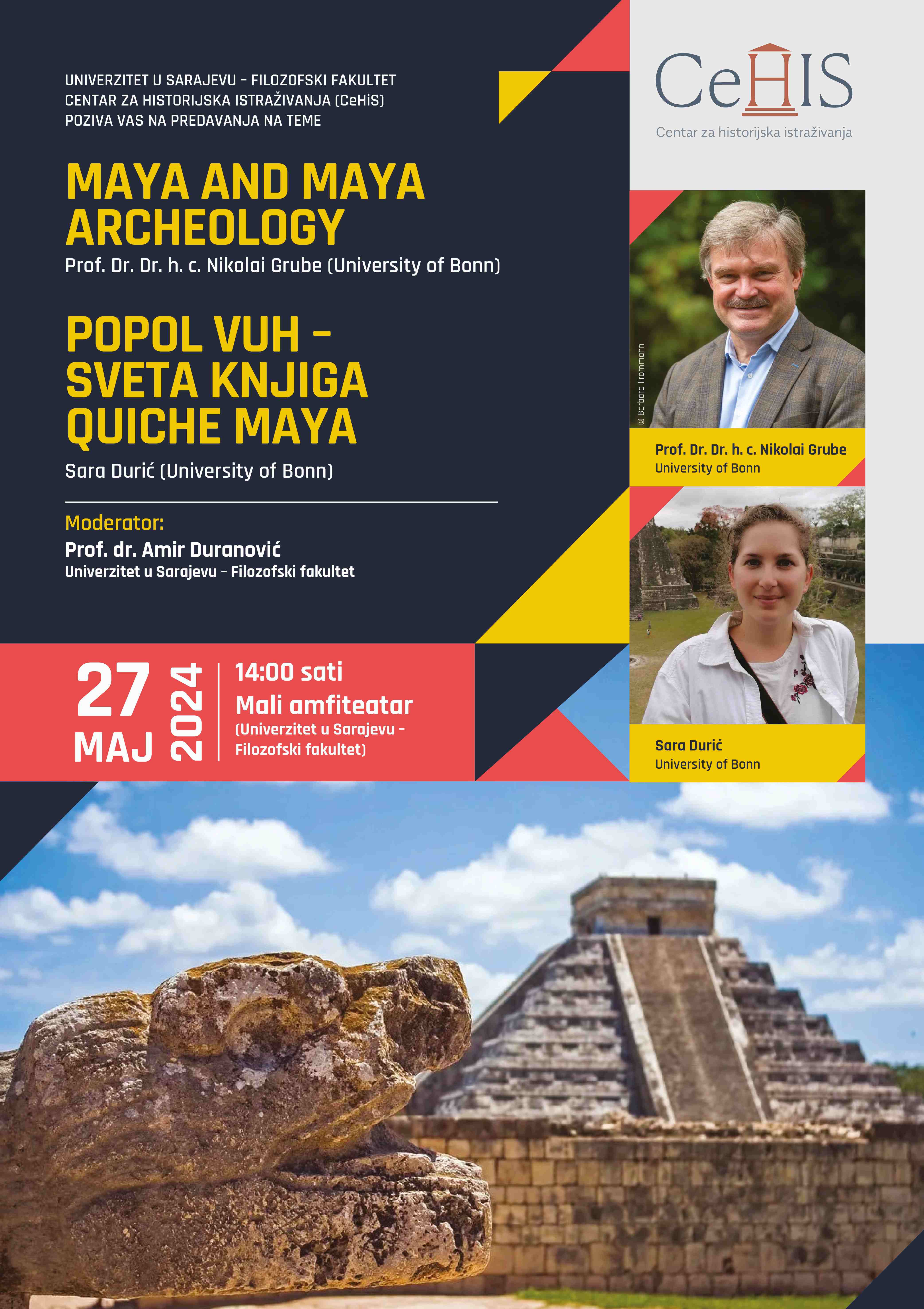 U Centru za historijska istraživanja (CeHiS) gostovat će stručnjaci sa Univerziteta u Bonu (Universität Bonn) koji će kroz tri predavanja i stručnu radionicu svim zainteresiran približiti egzotičnu civilizaciju Maya. Zahvaljujući ovoj posjeti na Univerzitetu u Sarajevu - Filozofskom fakultetu bosanskohercegovačka akademska zajednica i šira zainteresirana javnost imat će priliku da sazna više o egzotičnoj civilizaciji koja se razvijala na prostoru jugoistočnog Meksika i sjeveru srednje Amerike. Civilizacija Maya poznata je po svojoj specifičnoj arhitekturi i kulturi kao što su piramide i autohtono pismo. To su teme o kojima će zainteresirani moći otkriti više kroz sadržaj tri predavanja i radionicu koji su planirani za 27. i 28. 05.2024. godine. Pored afirmiranih historičara i arheologa na radionici će učestovati i pripadnica indigenog naroda Maya Kaqchikel iz Guatemale Francisca Elías.