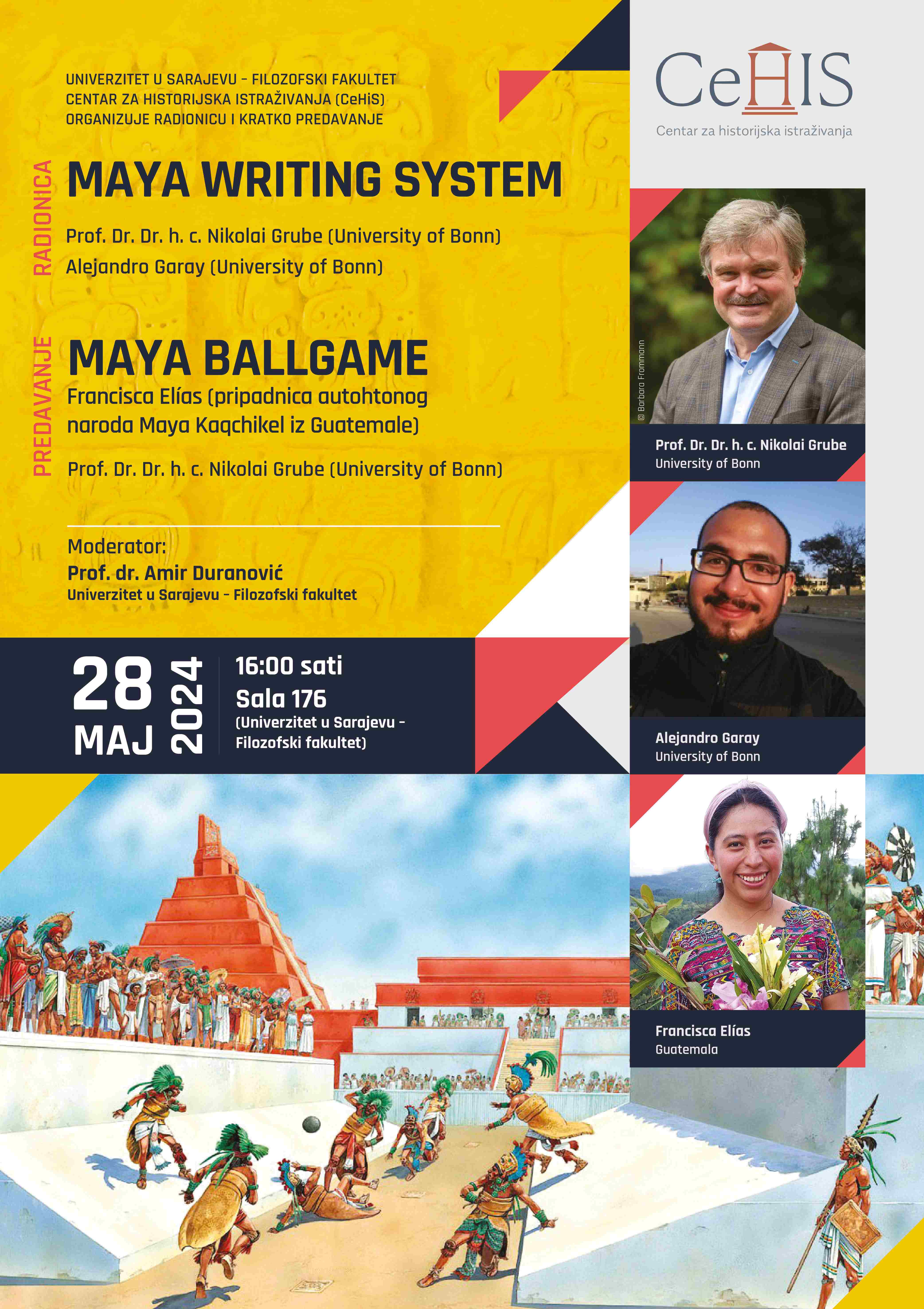 Edukativna radionica i treće predavanje predviđeni su za utorak 28.05.2024. u terminu od 16 -18 sati u Sali 176 (Univerzitetu u Sarajevu – Filozofski fakultet). Tema radionice je koju će voditi profesor Nikolai Grube i asistent Alejandro Garay (Universität Bonn) jeste „Maya writing system“ . Na kraju će Francisca Elías kao pripadnica naroda koji baštini kulturu Maya osvrnuti se na njihovu tradicionalnu igru sa loptom koju neki smatraju pretečom nogometa u svom predavanju na temu „Maya Ballgame“. Ispred Centra za historijska istraživanja predavanja i radionicu moderirati će prof. dr. Amir Duranović (Odsjek za historiju, Univerzitet u Sarajevu – Filozofski fakultet).