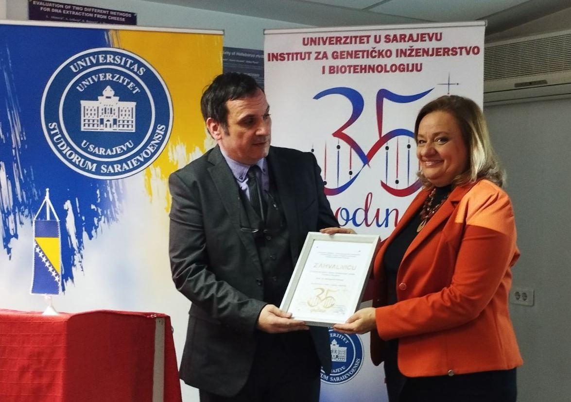 Zahvalnice na doprinosu u radu Instituta za genetičko inženjerstvo i biotehnologiju (INGEB) uručene su rektoru prof. dr. Rifatu Škrijelju i ministrici prof. dr. Aleksandri Nikolić, koji su ovom prigodom i presjekli vrpcu i otvorili „Otvorenu biotehnološku platformu“.