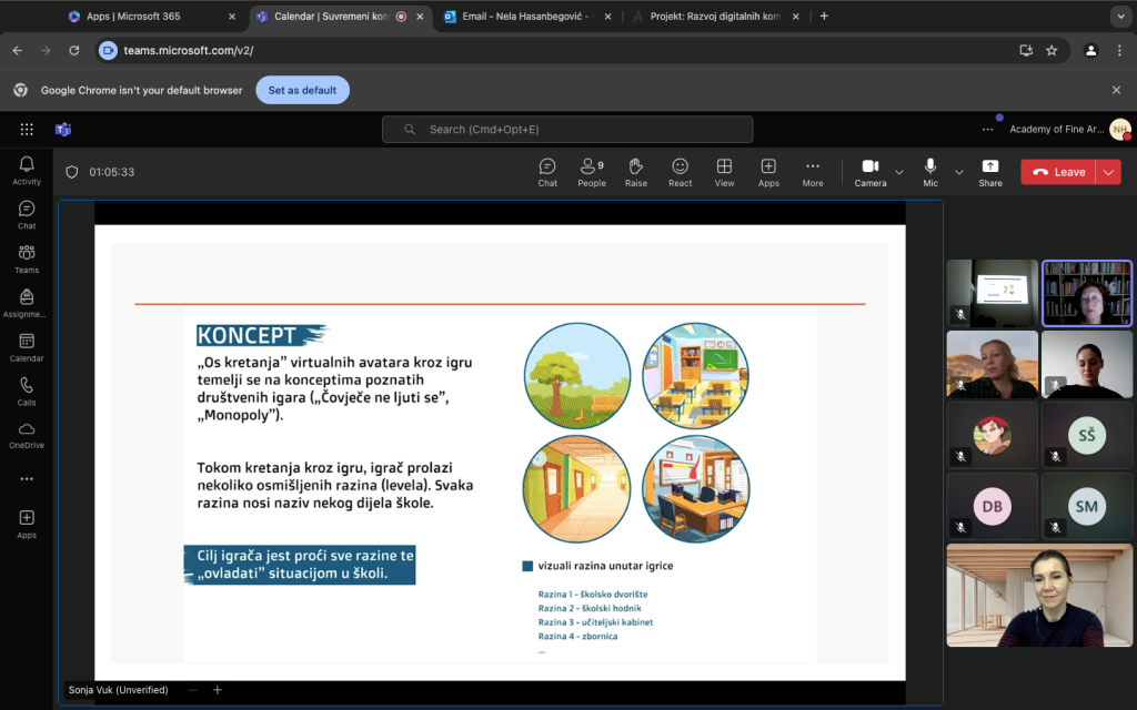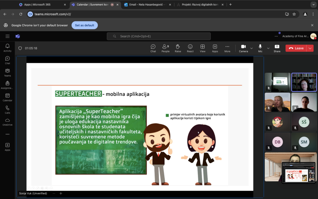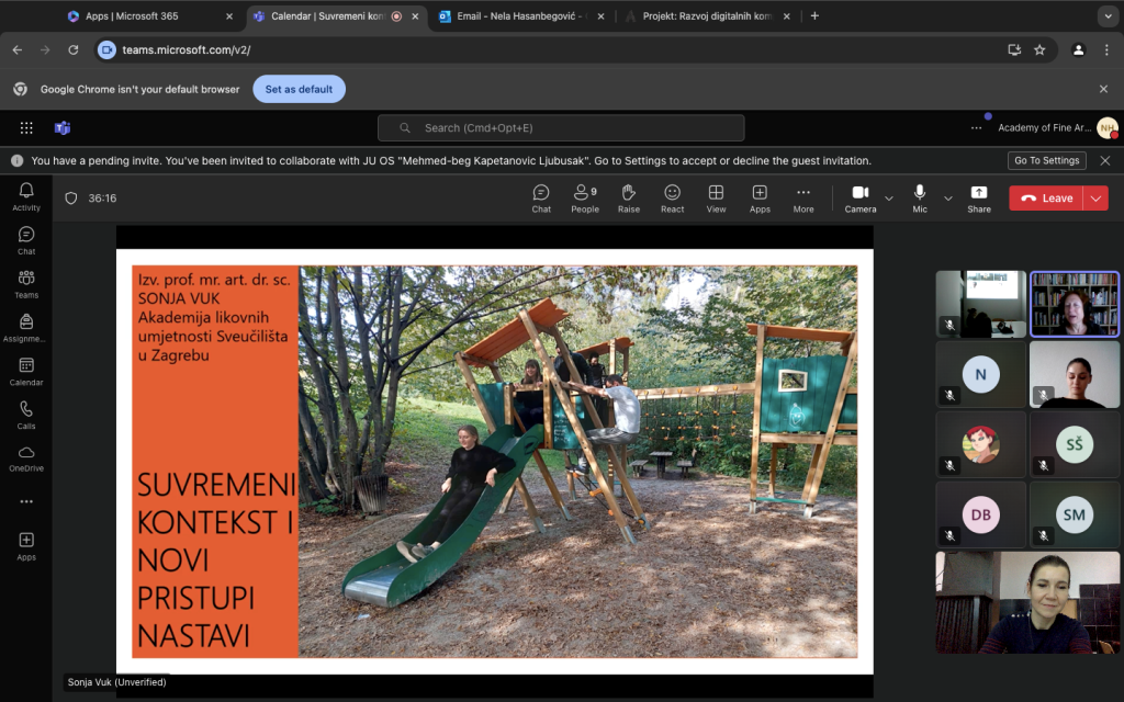 Gostujuće online predavanje pod nazivom Suvremeni kontekst i novi pristupi u nastavi, se održalo na platformi Teams i In Class Akademije likovnih umjetnosti Univerziteta u Sarajevu, u četvrtak 28.11. 2024. godine s početkom u 12:30 sati. U nastavku su fotografije i screenshots s realiziranog predavanja.