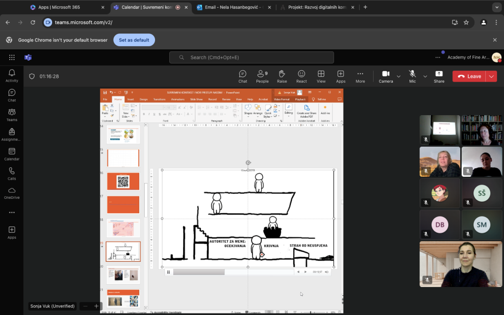 Održano je gostujuće online predavanje u sklopu projekta Razvoj digitalnih kompetencija i njihov uticaj na inovativne pristupe u nastavnoj praksi studenata/ica Akademije likovnih umjetnosti Univerziteta u Sarajevu, koje je realizirala izv. prof. mr. art. dr. sc Sonja Vuk uposlenica Nastavničkog odsjeka Akademije likovnih umjetnosti Sveučilišta u Zagrebu.