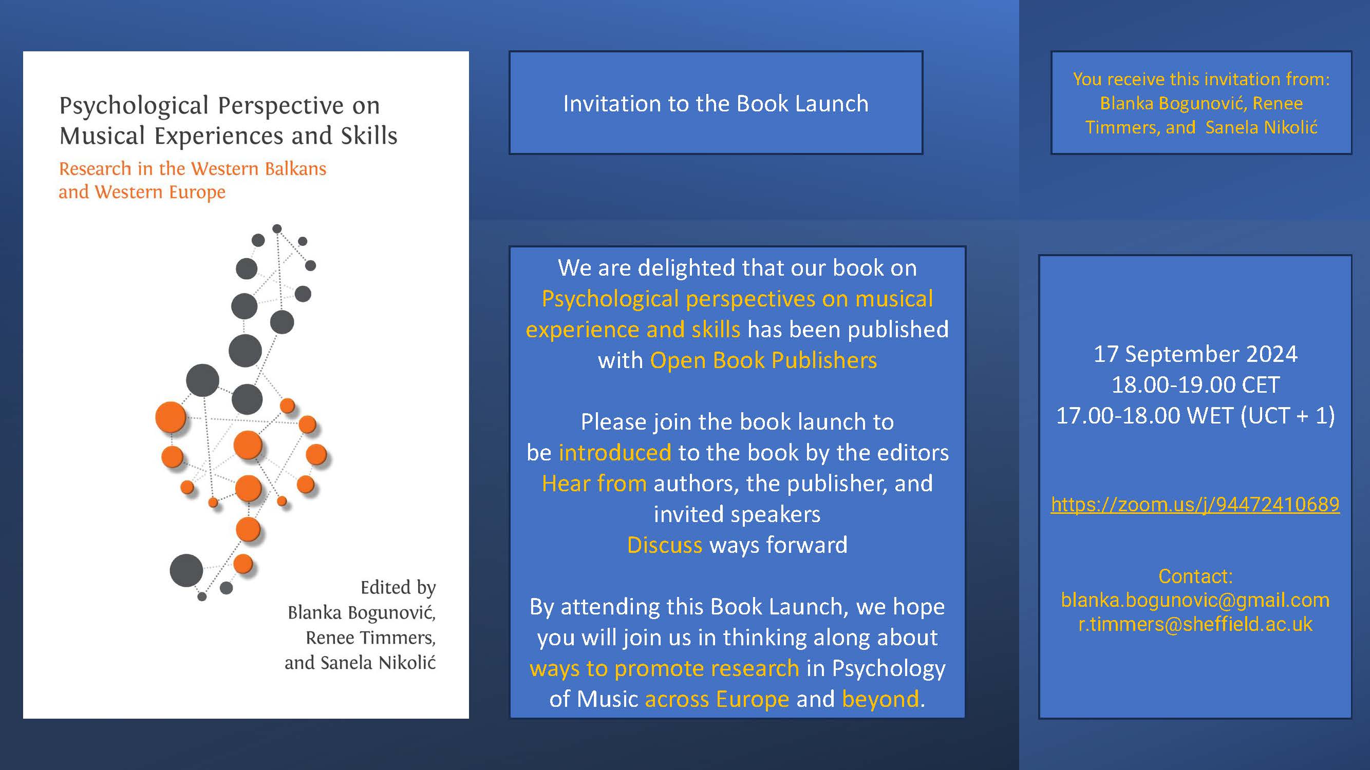 Sa zadovoljstvom vas pozivamo na online predstavljanje knjige Psychological Perspectives on Musical Experiences and Skills. Research in the Western Balkans and Western Europe koja je zajednički projekat istraživača iz Evrope (ESCOM) i regiona Zapadnog Balkana, članova Regionalne mreže psihologija i muzika (RNPaM). Doc. dr. Mirsada Zećo (Pedagoški fakultet Univerziteta u Sarajevu), dr. sc. Marina Videnović (Institut za psihologiju Univerziteta u Beogradu) i prof. dr. Lejla Silajdžić (Pedagoški fakultet Univerziteta u Sarajevu) autorice su poglavlja "Sound Experience and Imagination at Early School Age: An Opportunity for Unleashing Children’s Creative Potential".