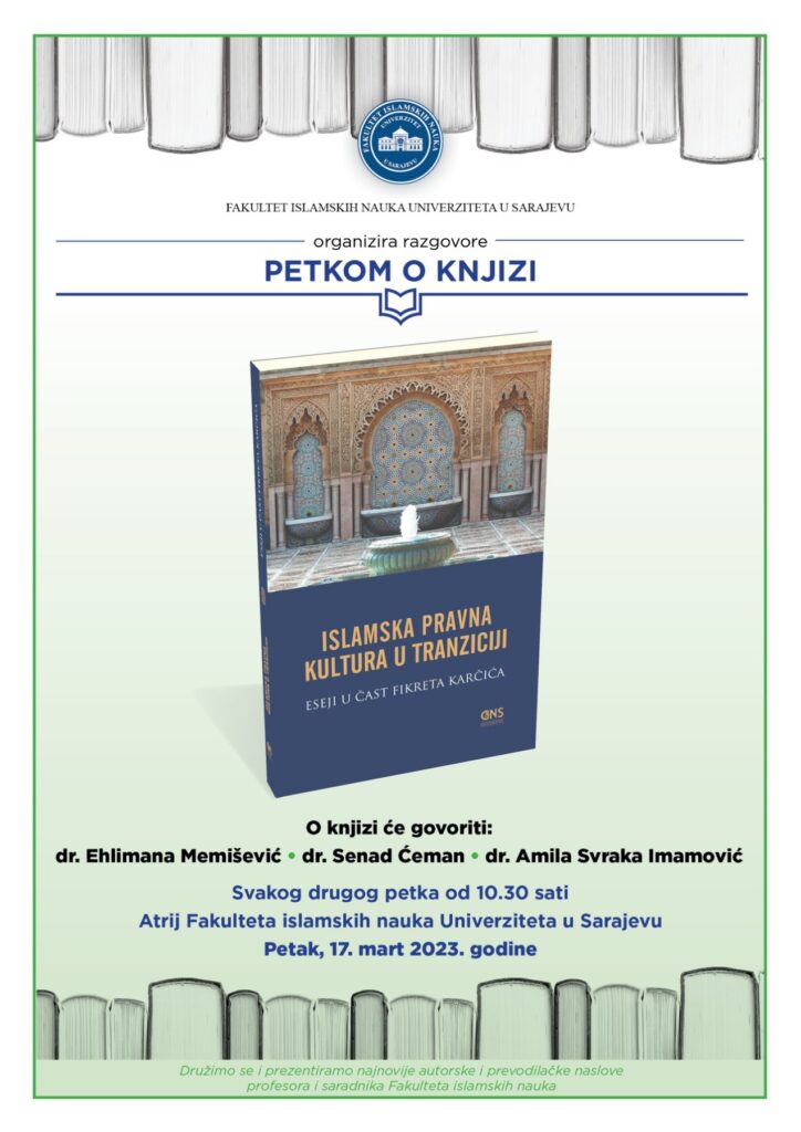 U okviru aktivnosti „Petkom o knjizi“, danas je na Fakultetu islamskih nauka Univerziteta u Sarajevu upriličeno predstavljanje knjige Islamska pravna kultura u tranziciji – Eseji u čast Fikreta Karčića. Djelo su predstavili dr. Ehlimana Memišević, dr. Senad Ćeman i dr. Amila Svraka Imamović. Program je moderirala dr. Zehra Alispahić, a u diskusiji su učestvovali prisutni nastavnici, saradnici, studenti i gosti. “Petkom o knjizi” je aktivnost kroz koju, svakog drugog petka, na Fakultetu islamskih nauka razgovaramo o najnovijim naslovima – autorskim i prevodilačkim radovima profesora i saradnika Fakulteta islamskih nauka.