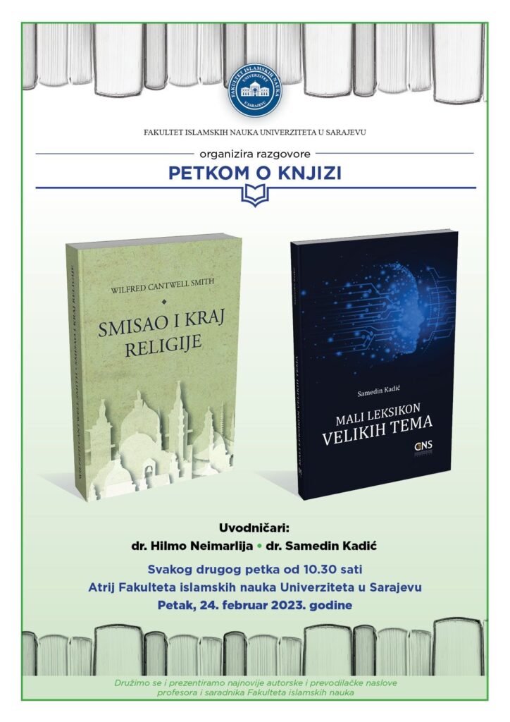 U okviru aktivnosti „Petkom o knjizi“, danas je na Fakultetu islamskih nauka upriličeno predstavljanje, a potom i razgovor djelima Smisao i kraj religije autora Wilfred Cantwell Smitha u prijevodu doc. dr. Kadića i Mali leksikon velikih tema – autorskom djelu doc. dr. Kadića. Djela su predstavili prof. dr. Hilmo Neimarlija i doc. dr. Samedin Kadić. U diskusiji su učestvovali prisutni nastavnici, saradnici i studenti. “Petkom o knjizi” je aktivnost kroz koju, svakog drugog petka na Fakultetu islamskih nauka razgovaramo o najnovijim naslovima – autorskim i prevodilačkim radovima profesora i saradnika Fakulteta islamskih nauka.