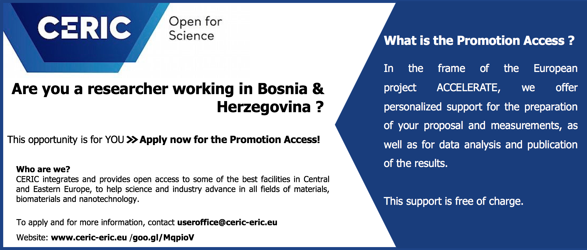 CERIC - Konzorcij srednjoevropskih istraživačkih infrastruktura je u okviru projekta Horizon 2020 ACCELERATE (731112) razvio „Pilot otvorenog pristupa“ za promocije istraživača iz pojedinih zemalja s ciljem pružanja podrške za pristup vrhunskim istraživačkim infrastrukturama. Kroz Pilot se pruža besplatna personalizirana podrška istraživačima u vezi sa pripremom istraživanja, kao i obradom i objavom rezultata.