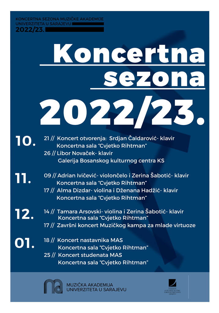Muzička akademija Univerziteta u Sarajevu (MAS UNSA) nastavlja intenzivnu umjetničku djelatnost i najavljuje Koncertnu sezonu 2022/23. koja se realizuje kao reprezent entuzijastičnog rada studenata, nastavnika i saradnika ove institucije čije djelovanje lokalnu scenu obogaćuje novim muzičkim sadržajima.