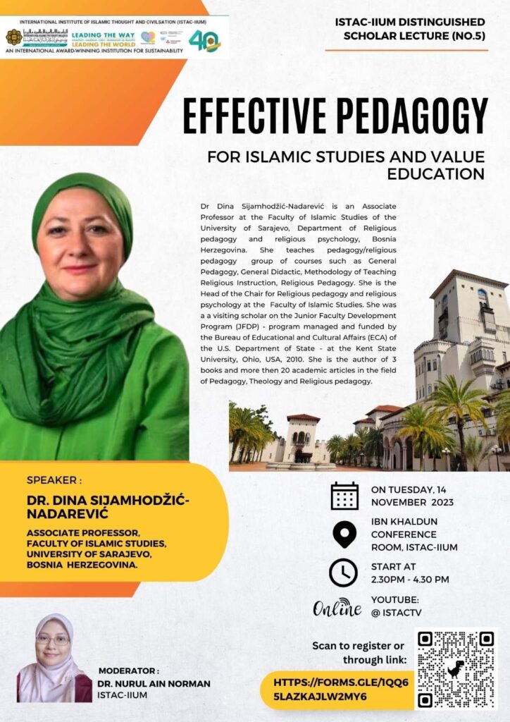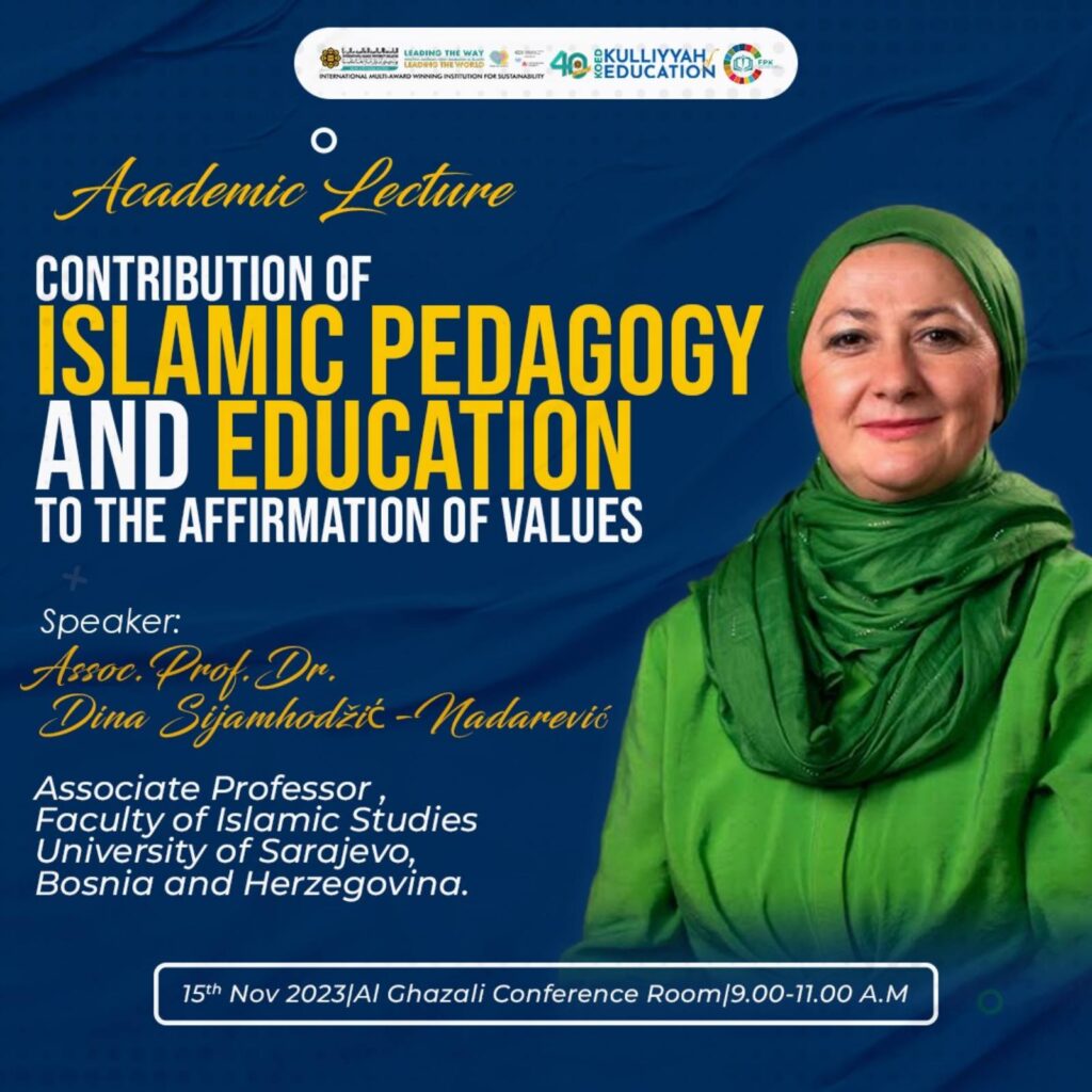Dana 15. novembra na Pedagoškom fakultetu (Kulliyyah of Education) održala je predavanje o temi „Contribution of Islamic pedagogy and education to the affirmation of values/Doprinos islamske pedagogije i islamskog obrazovanja afirmaciji vrijednosti“.